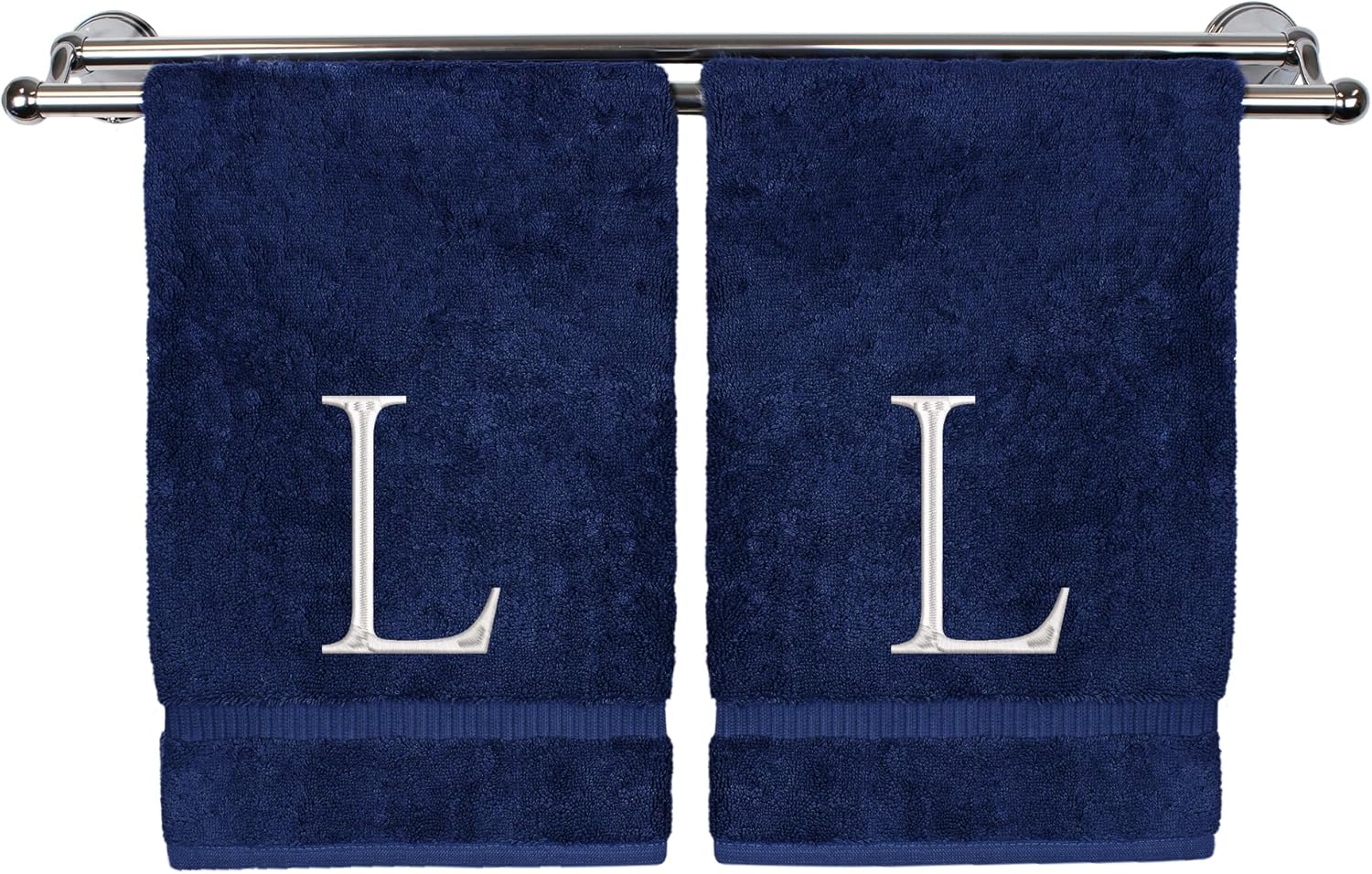 Monogrammed Hand Towel, Personalized Initial Gift, Extra Absorbent 100% Turkish Cotton - Soft Terry Finish - Set of 2 - White Block Initial L - Embroidered on Navy Blue Towels