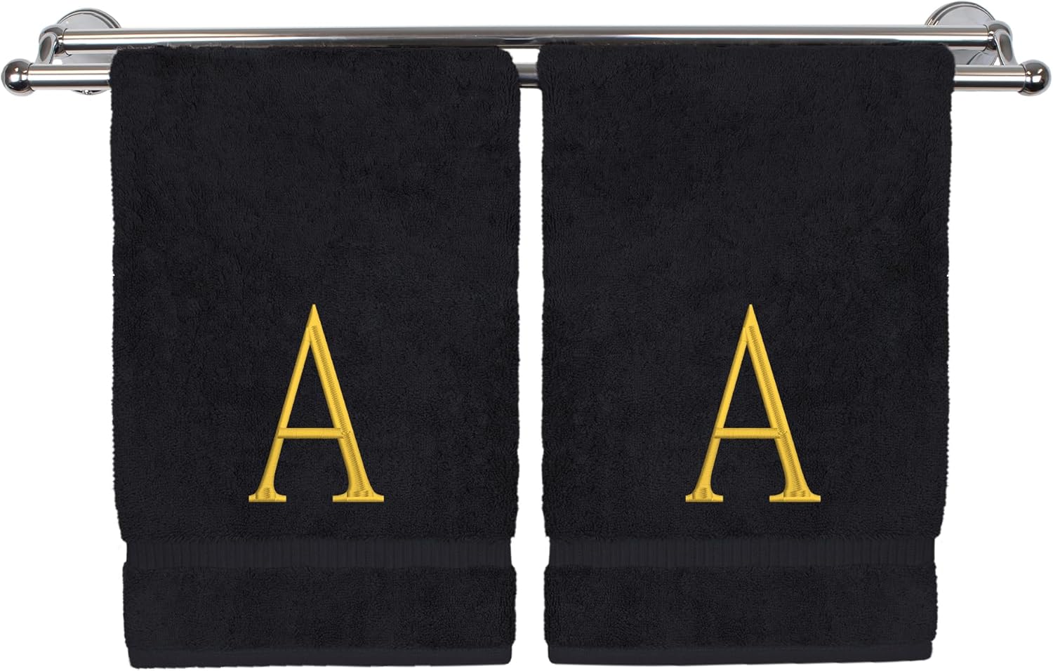 Monogrammed Hand Towel, Personalized Initial Gift, Extra Absorbent 100% Turkish Cotton - Soft Terry Finish - Set of 2 - Gold Block Initial A - Embroidered on Black Towels