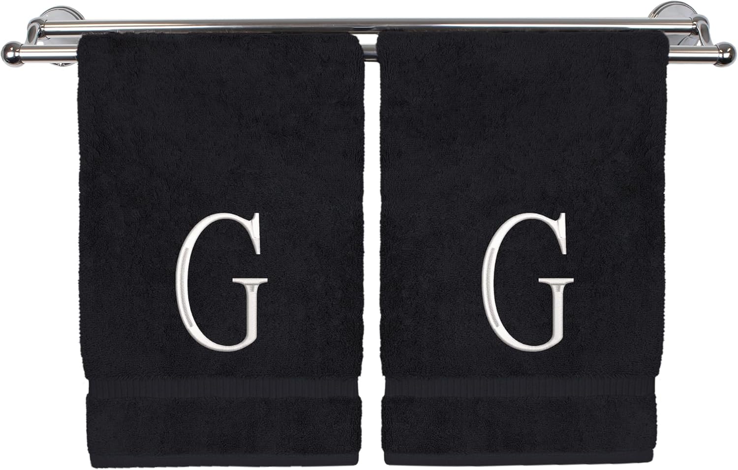 Monogrammed Hand Towel, Personalized Initial Gift, Extra Absorbent 100% Turkish Cotton - Soft Terry Finish - Set of 2 - White Block Initial G - Embroidered on Black Towels