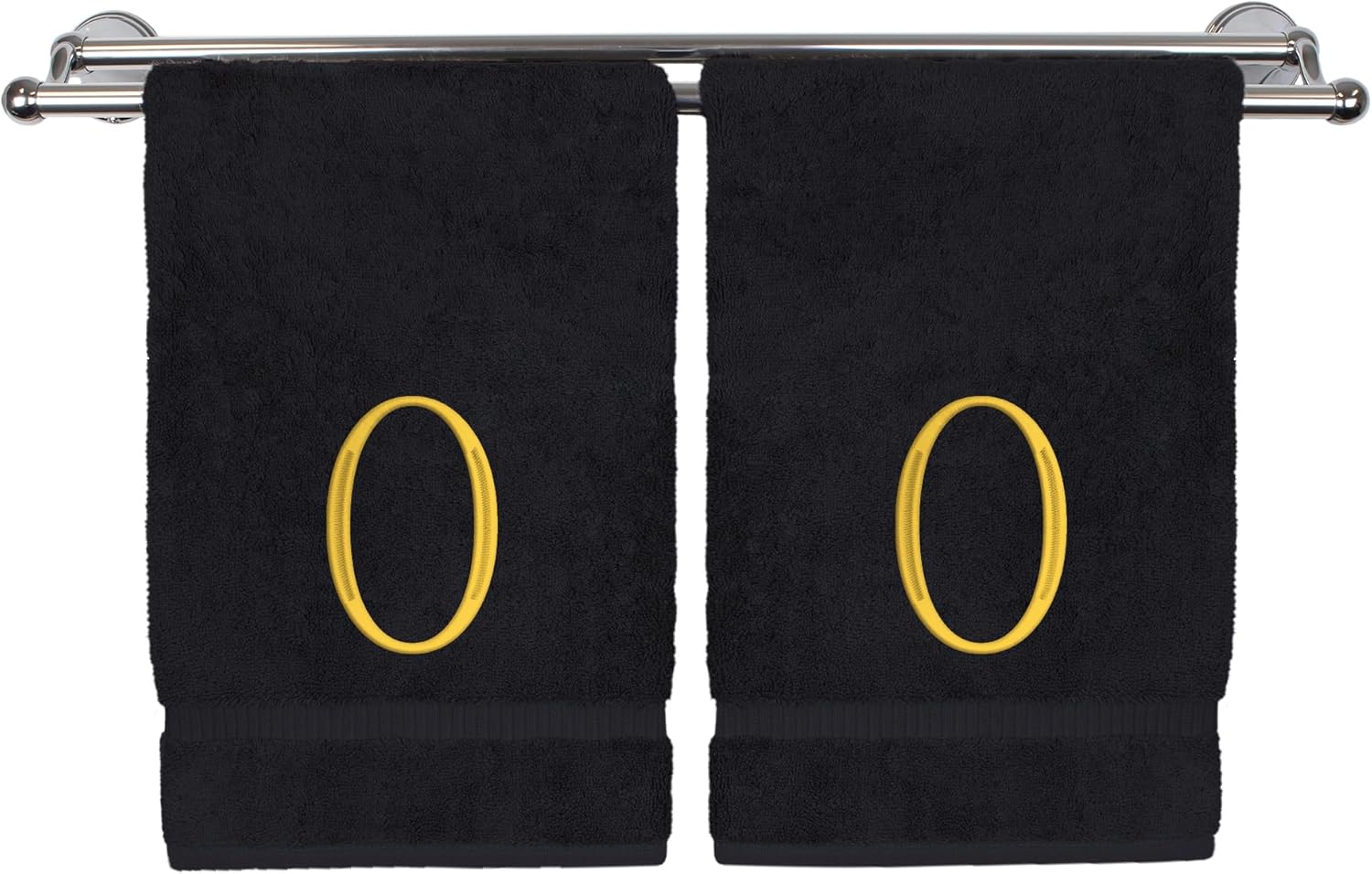 Monogrammed Hand Towel, Personalized Initial Gift, Extra Absorbent 100% Turkish Cotton - Soft Terry Finish - Set of 2 - Gold Block Initial O - Embroidered on Black Towels