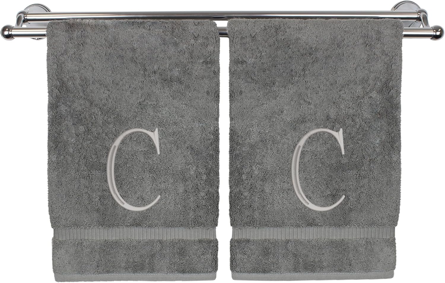 Monogrammed Hand Towel, Personalized Initial Gift, Extra Absorbent 100% Turkish Cotton - Soft Terry Finish - Set of 2 - Silver Block Initial C - Embroidered on Grey Towels