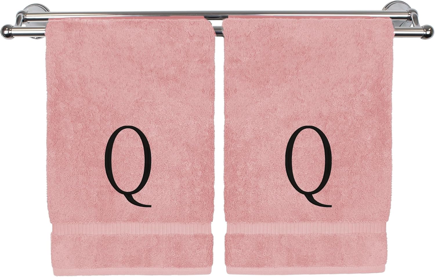 Monogrammed Hand Towel, Personalized Initial Gift, Extra Absorbent 100% Turkish Cotton - Soft Terry Finish - Set of 2 - Black Block Initial Q - Embroidered on Pink Towels
