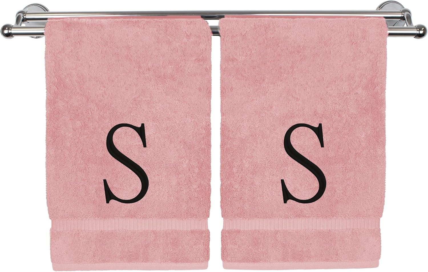 Monogrammed Hand Towel, Personalized Initial Gift, Extra Absorbent 100% Turkish Cotton - Soft Terry Finish - Set of 2 - Black Block Initial S - Embroidered on Pink Towels