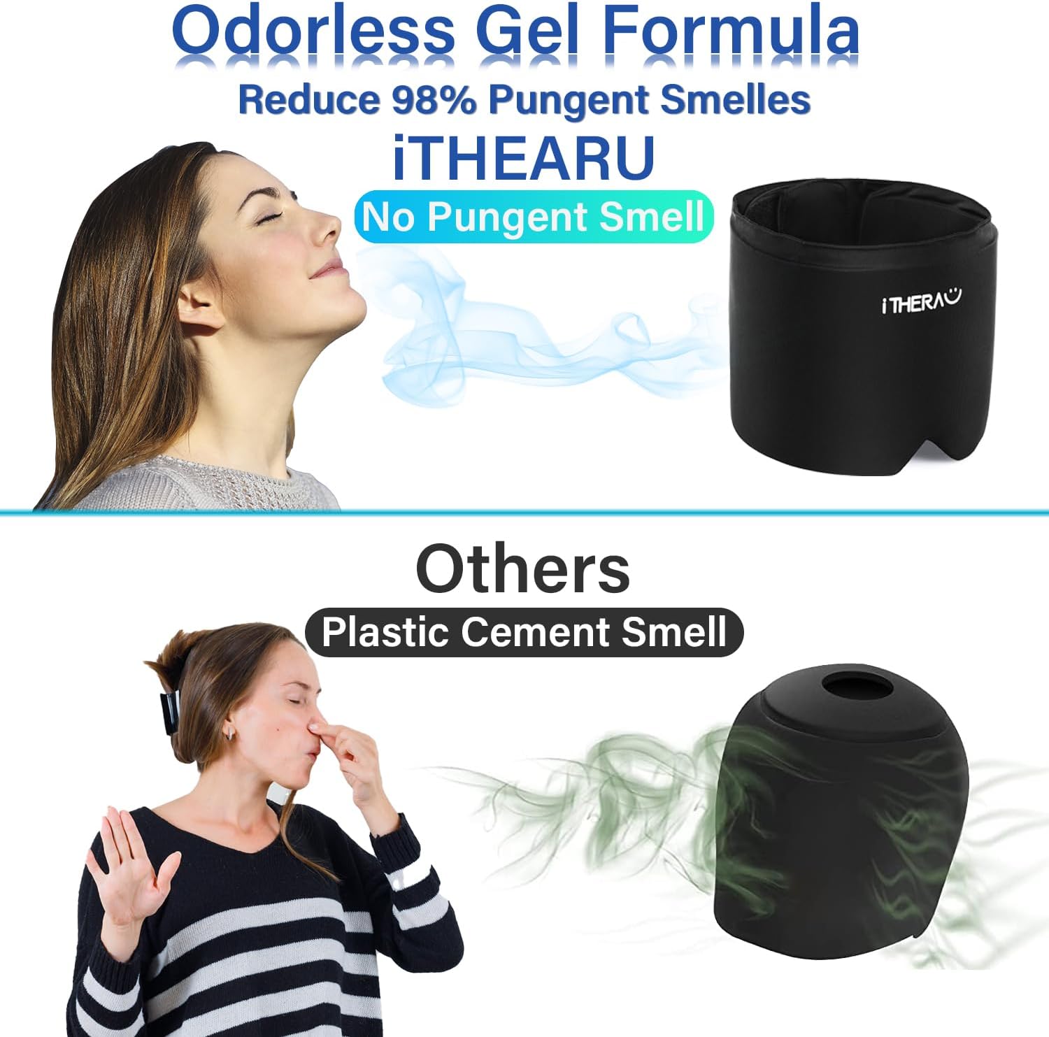 - Updated Odorless Material - Different from other old ice cap for migraines, our headache mask made with cutting-edge material and expert-grade gel, it's already cool without even frozen. Non-toxic and with no smell, thick solid gel stays cold longer, remains smooth and pliable when frozen, very cozy to wear. Stretchable gel conforms closely to all different head shape, gives tight compression to the head, provides more cold penetration to relieve headache, migraine and tension
