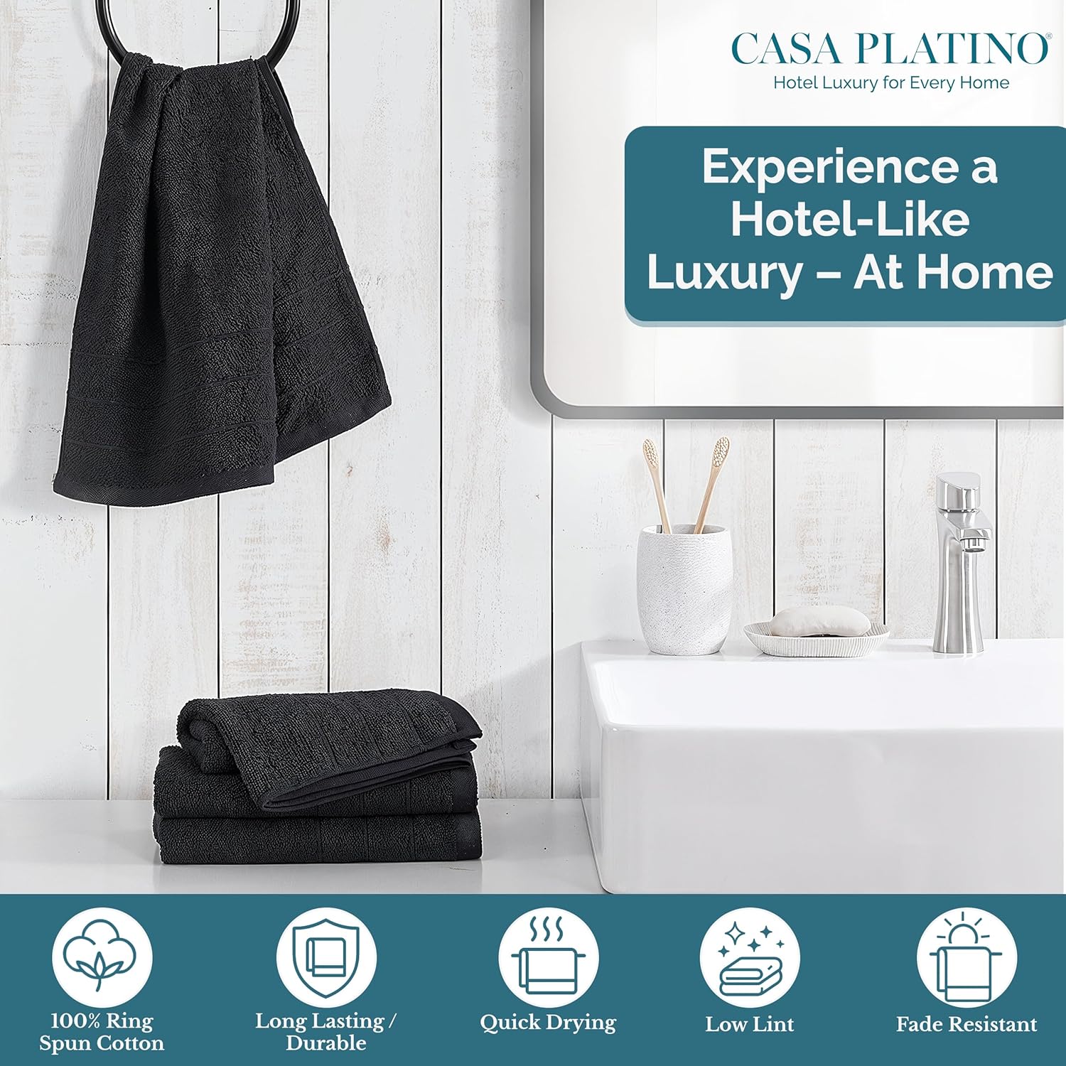 Casa Platino 4 Pack Hand Towels for Bathroom (16"x28") - Spa & Hotel Quality - 100% Cotton, Ring Spun - Quick Dry, Ultra Soft & Absorbent Black Hand Towels Set of 4 - Perfect for Everyday Use - Black