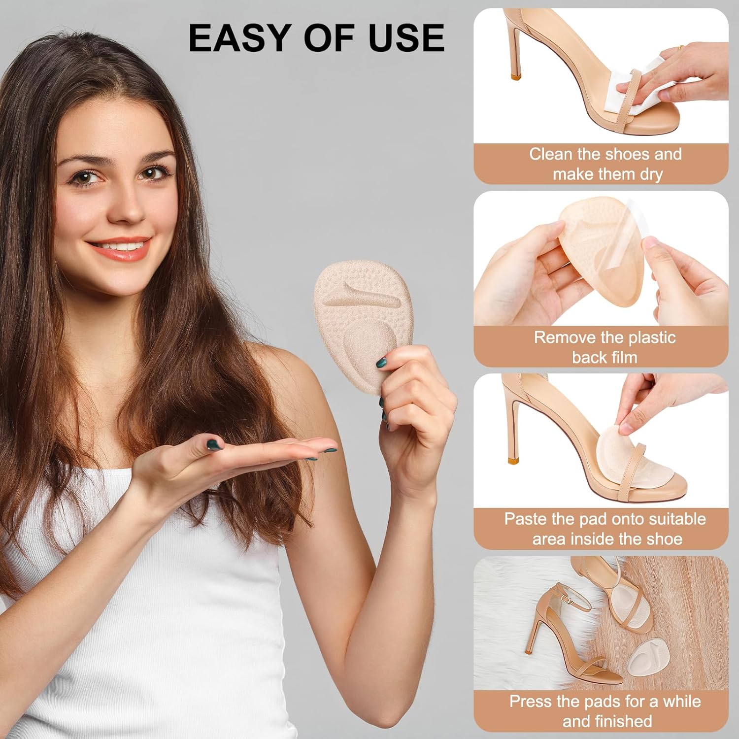 - ๐๐๐จ๐ฎ ๐ฉ๐ค ๐๐จ๐: For the heel cushion pads, just remove the back film and stick it to the shoe heel area for a snug fit; and for the ball of foot cushions, just remove the back film and paste it onto the shoe where make your foot feel comfortable. No need for complicated adjustments or tools.