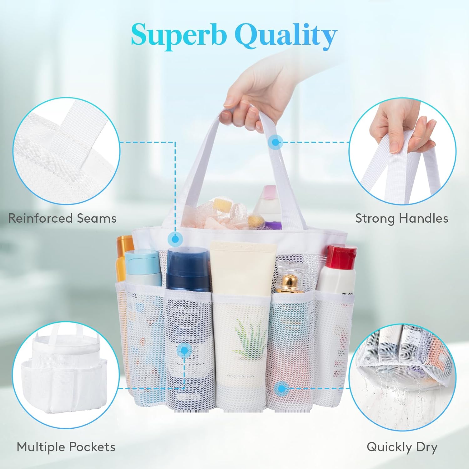 Lifewit Mesh Shower Caddy Freestanding Portable Shower Tote Bag for College Dorm, Bathroom, Gym, Travel, Quick Dry Hanging Shower Organizer with 7 Storage Pockets for Toiletry Essentials, White