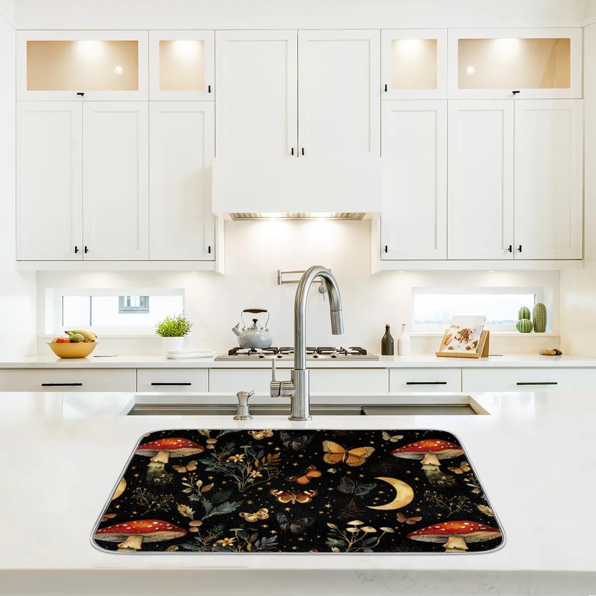 Hexteria Mushrooms and Butterflies Dish Drying Mat for Kitchen Counter Microfiber Absorbent Dish Draining Reusable Washable Foldable Large 16"x18"