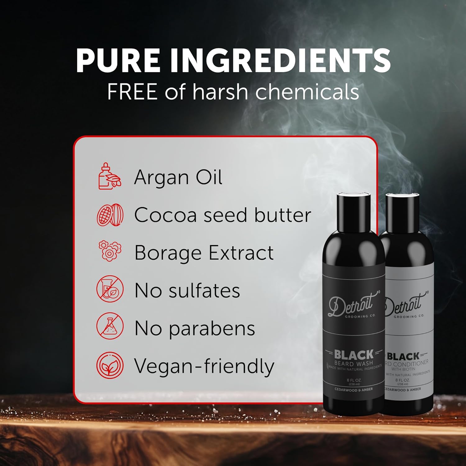 Detroit Grooming Co. Beard Wash and Beard Conditioner - Men's Kit - Softens, Strengthens, Moisturize, Infused w/Argan Oil, Apple Extract, & Aloe Vera - Cedarwood & Amber Scent - Black-8oz
