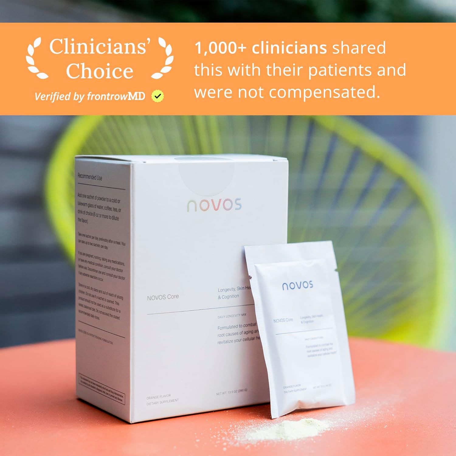 NOVOS Core Longevity Mix, Anti-Aging Supplement, Drink Powder Packet Orange Flavor - Skin Support, Energy, Mood, Sleep and Cognition Support - 30 Servings