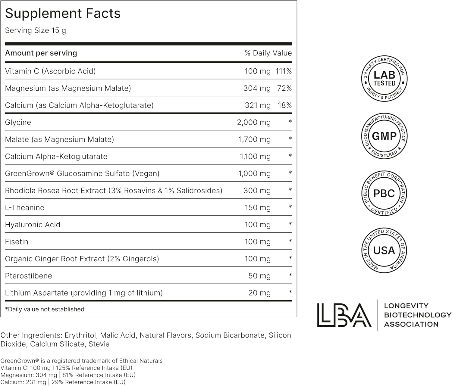 - Primary Supplement Type : Calcium Alpha-Ketoglutarate, Cognition, Longevity, NAD+, Skin
