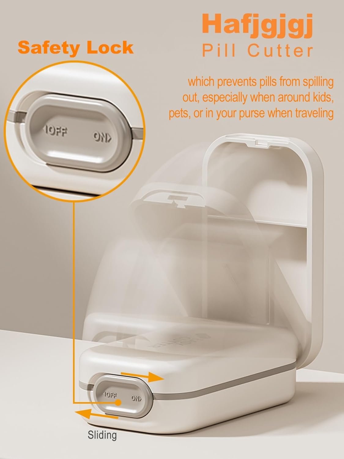 - Safety Lock: The closed cover with a sliding latch mechanism keeps the pills secure and prevents accidental spills