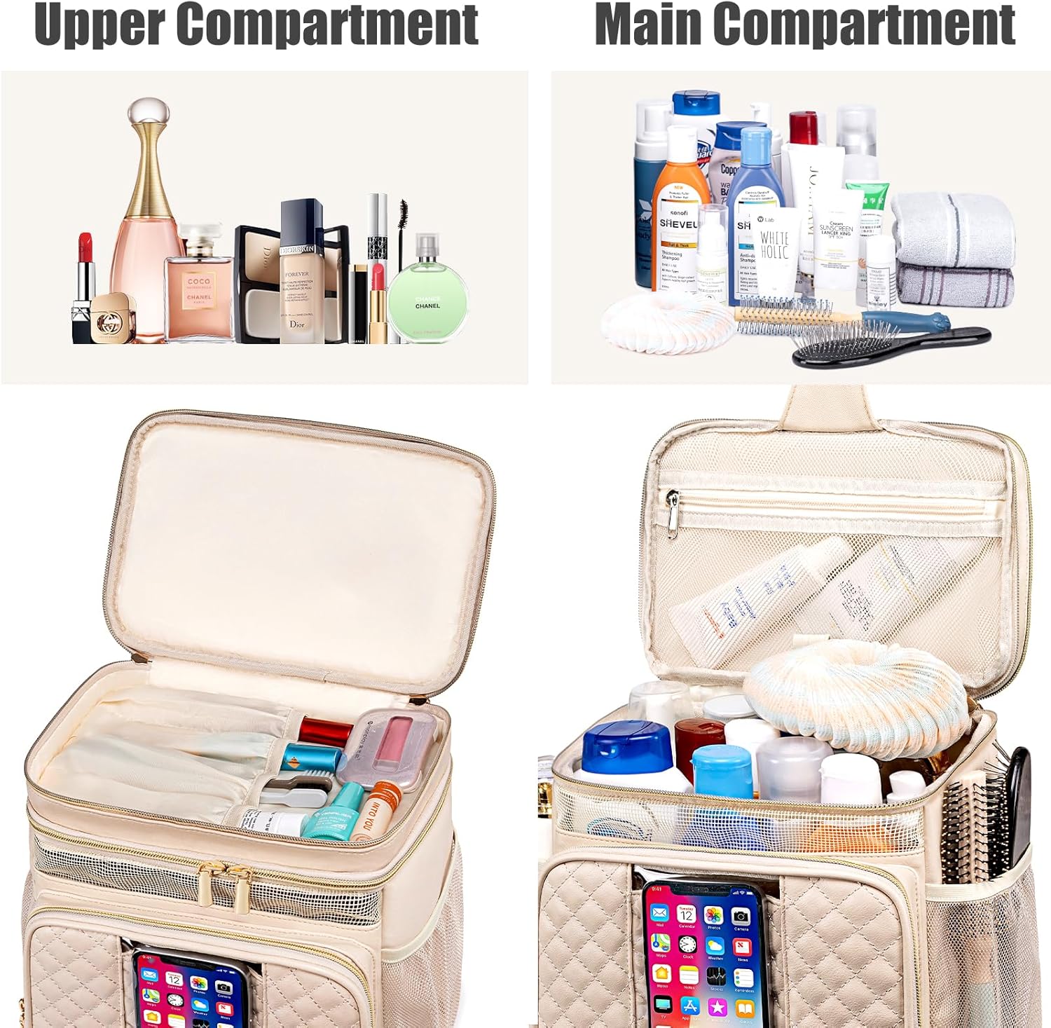 • 【Large Capacity & Versatile Compartment Toiletry Bag】The shower bag total 3 main zippered compartments and 8 pockets,7 flexible holders, ample pockets keep your toiletry items and cosmetics perfectly placed, zipper pocket on the inner top,front and back for convenient to store dry items and small essentials,7 flexible holders in different size to hold bottles,cosmetics and other items that cannot be placed upside down, mesh pockets on both sides for additional storage,The touchable transparent phone waterproof pocket for making and receiving calls,watching videos and listening to music