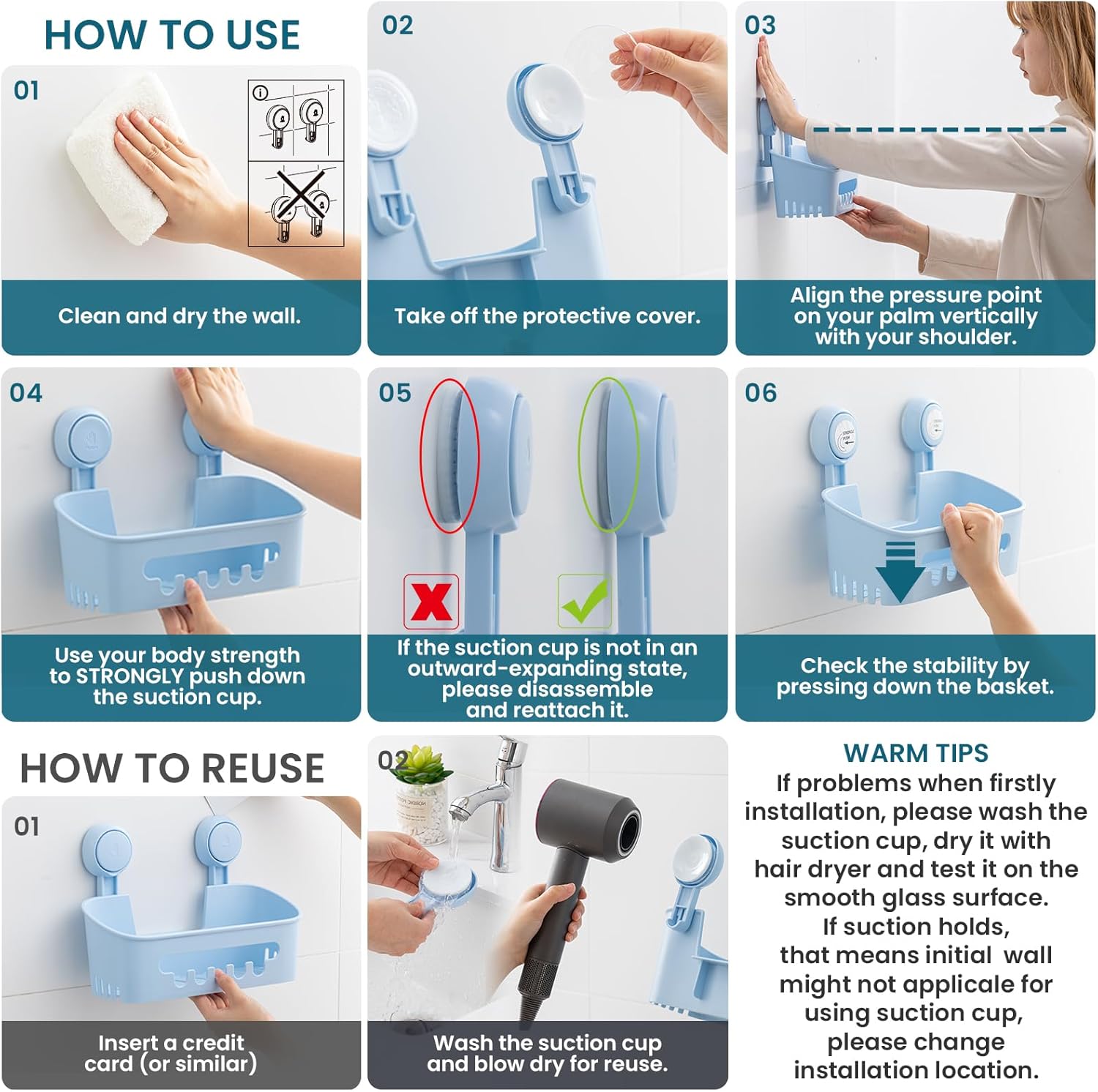 - Hassle-free Installation: Simply press down the suction cups with palm to squeeze the air out, they will stick to the wall firmly. You can finish the installation in 1 second, and put your items in the shelf immediately without waiting 24h. No screws, no nails, no glue needed. Damage-free to your wall. Shower caddies can be re-positioned many times and removed without leaving sticky marks and residue