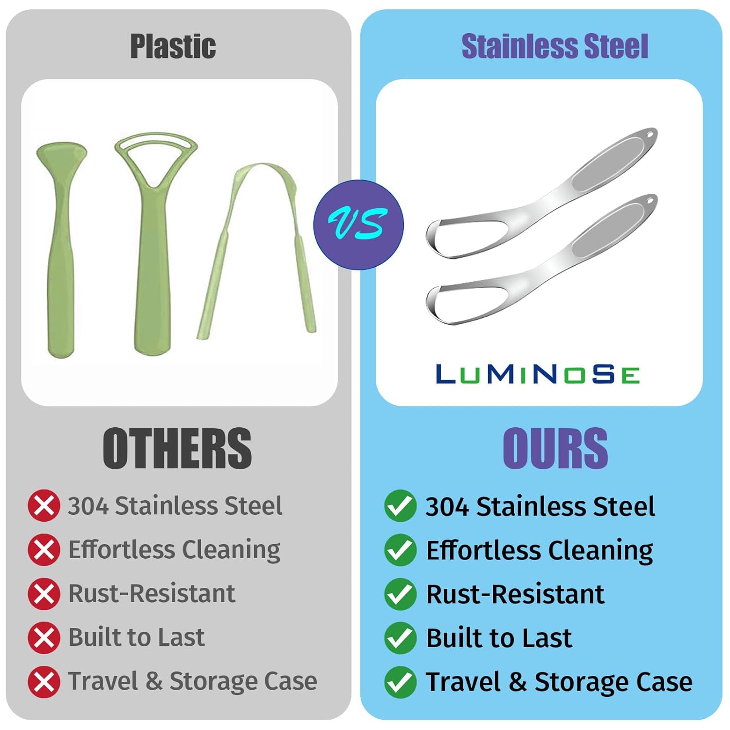 - REDUCE BAD BREATH: Remove food particles, and toxins from your tongue in seconds with our stainless steel tongue scraper. Regular use helps reduce bad breath, enhances taste, and boosts overall oral hygiene, leaving your mouth feeling fresher and your dental health improved after every use.
