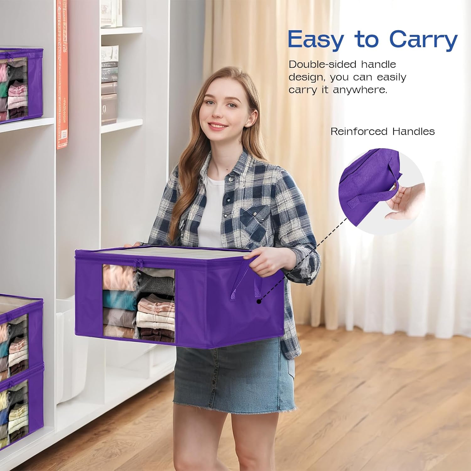 Clothes Storage Bags, Foldable Thick Fabric Blanket Storage Bags, Large Clear Window & Carry Handles, Great for Clothes, Blankets, Closets, Pillows, Toys (Purple, 6PACK)