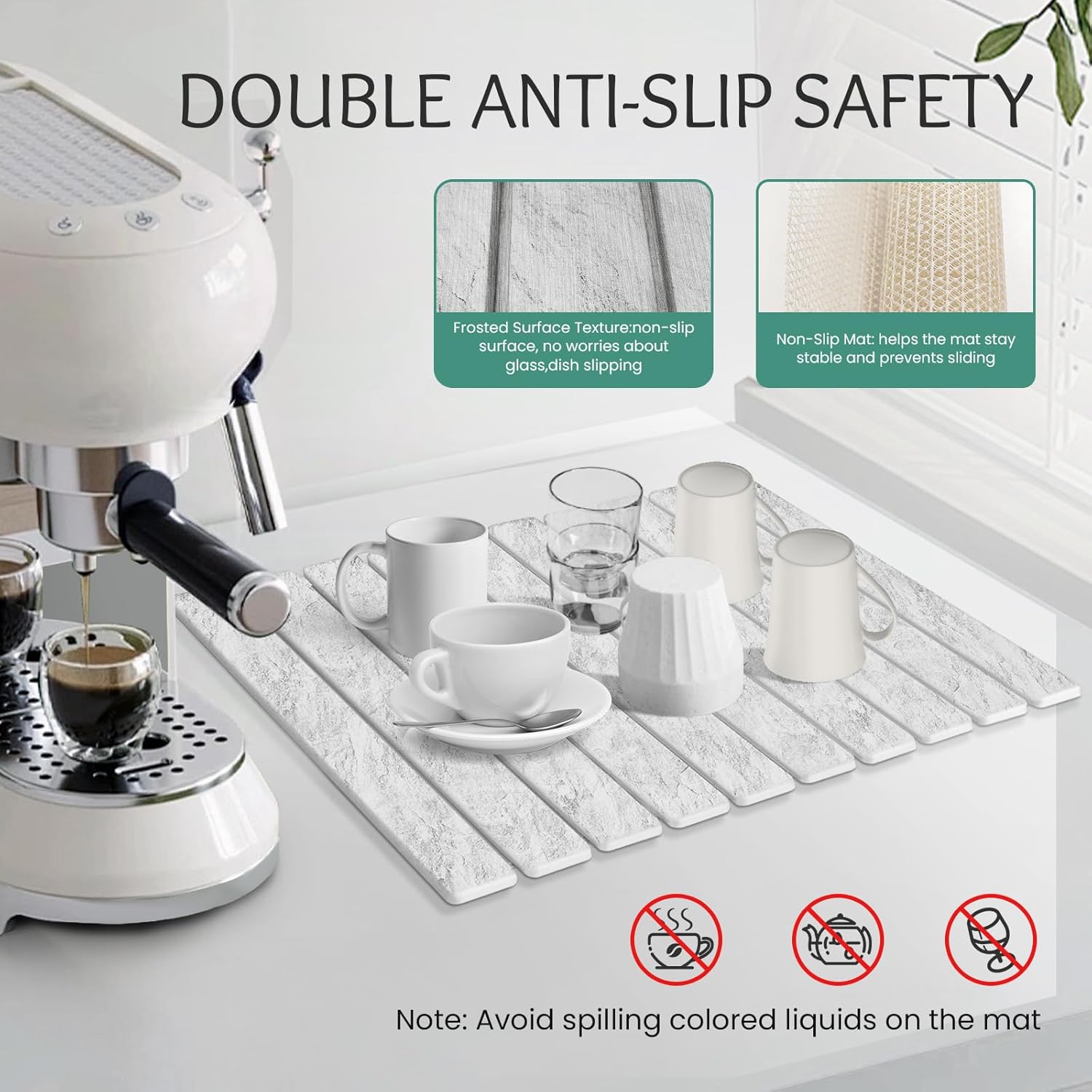 - 【Foldable & Rollable Design】:The diatomaceous mat what we designed is foldable and rollable,efficiently helping you achieve the idea of convenient storage.When not in use,can be folded or rolled up and placed in kitchen drawers,cabinets,clothing drawers etc;when during use,its large size provides spacious space for the tableware,cookware,cups etc.It comes with PVC anti slip pad that can be used together to achieve double-sided anti slip and double safety.Stone drying mat for kitchen counter to your kitchen countertops to be clean and organized.