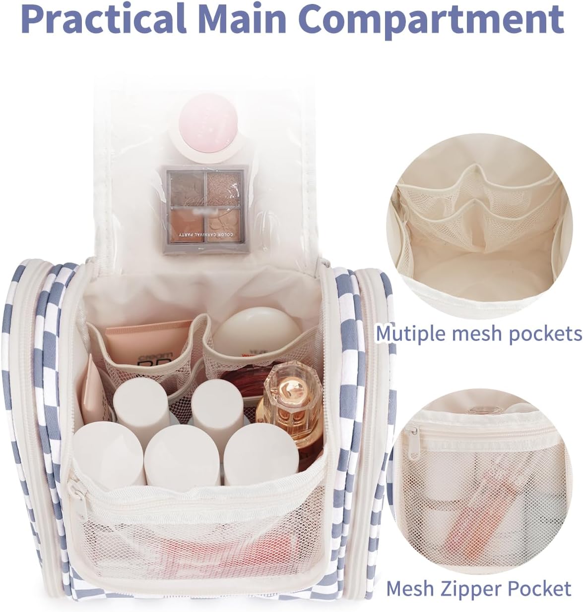 - DETAILS ORIENTED - Buit-in large metal hook allows hanging the toiletry case from towel rack, coat hook or whereever is available, making your toiletries and cosmetics displayed well for easy access, saving bathroom counter space as well. Water-resistent and durable fabric protects your gear from spills. Soft fabric and reliable zippers. Wide opening and rectangle shape makes it easy to stand on its own