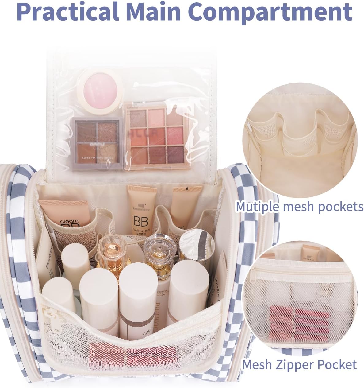 Narwey Checked Hanging Travel Toiletry Bag for Women, Travel Bag for Toiletries, Makeup Bag Organizer Cosmetic Bags Make Up Bags for Women (Grayish Blue Checkerboard)