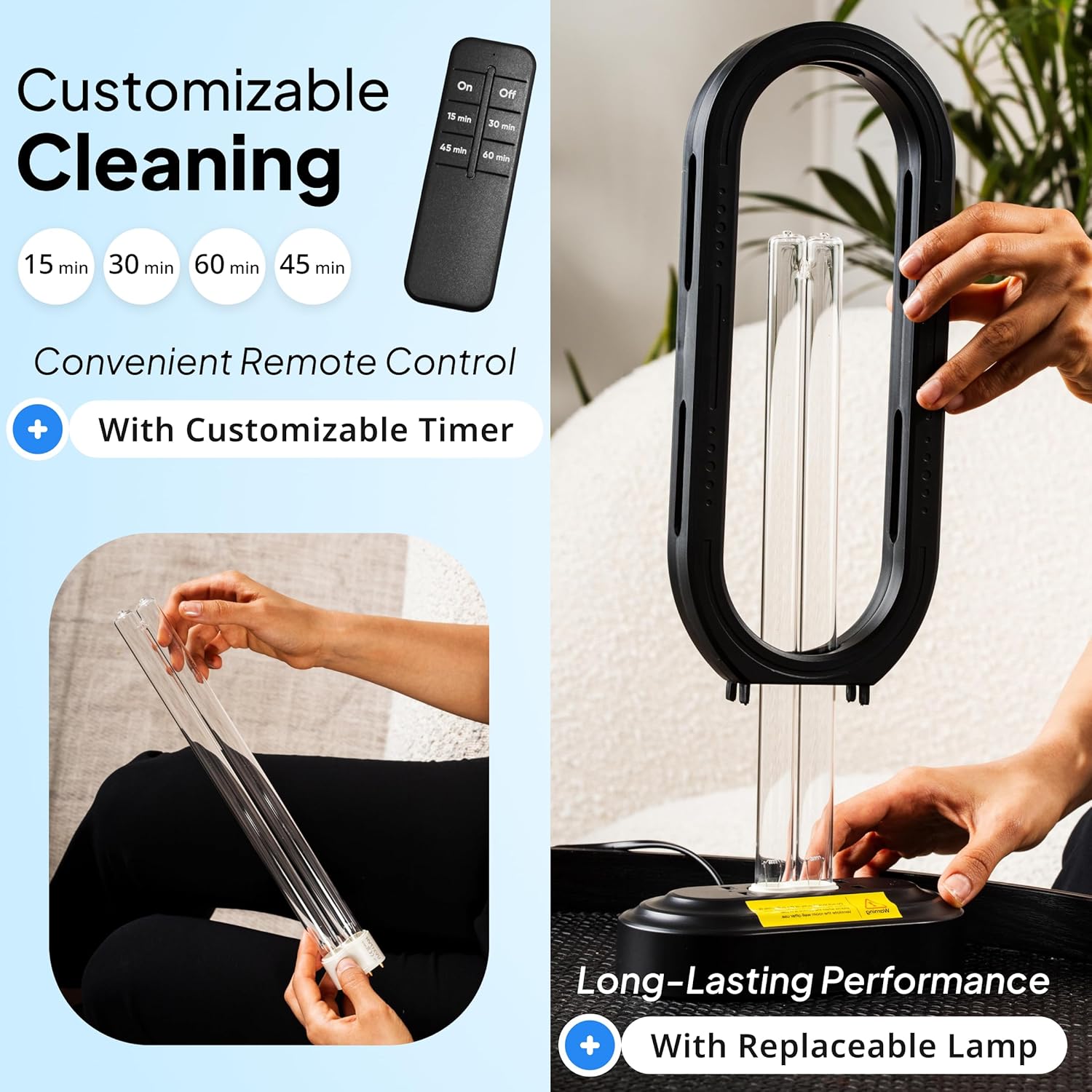 - [Multiple Time Option] Halo UVC light has 4 time modes: 15 minutes, 30 minutes, 45 minute and 60 minutes, which can be easily controlled by the remote control.