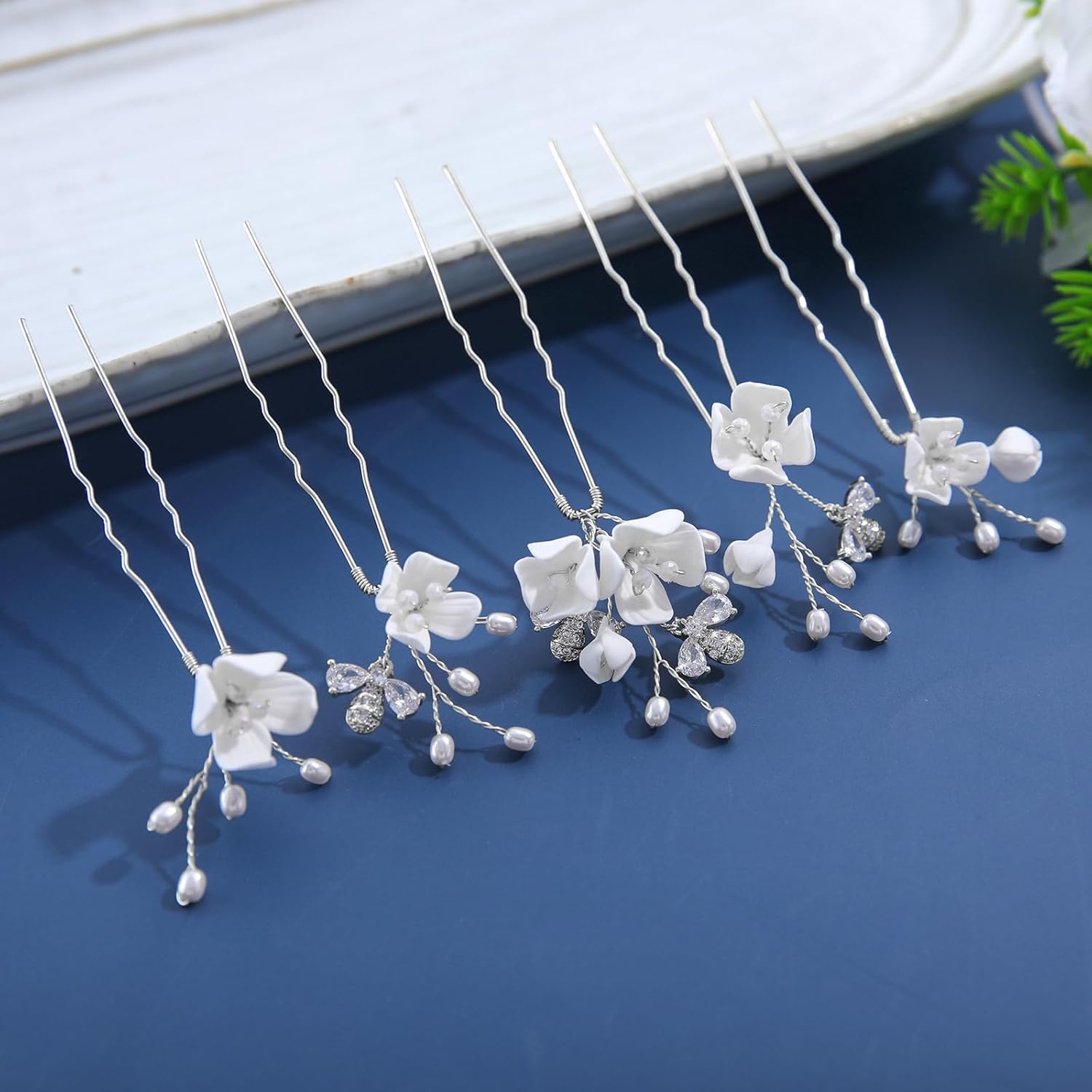 Handmade Bridal Wedding Hair Pins 5Pcs White Flower Zircon Pearl Hair Clips Silver Bridal Hair Accessories for Women Girls Brides Bridesmaid