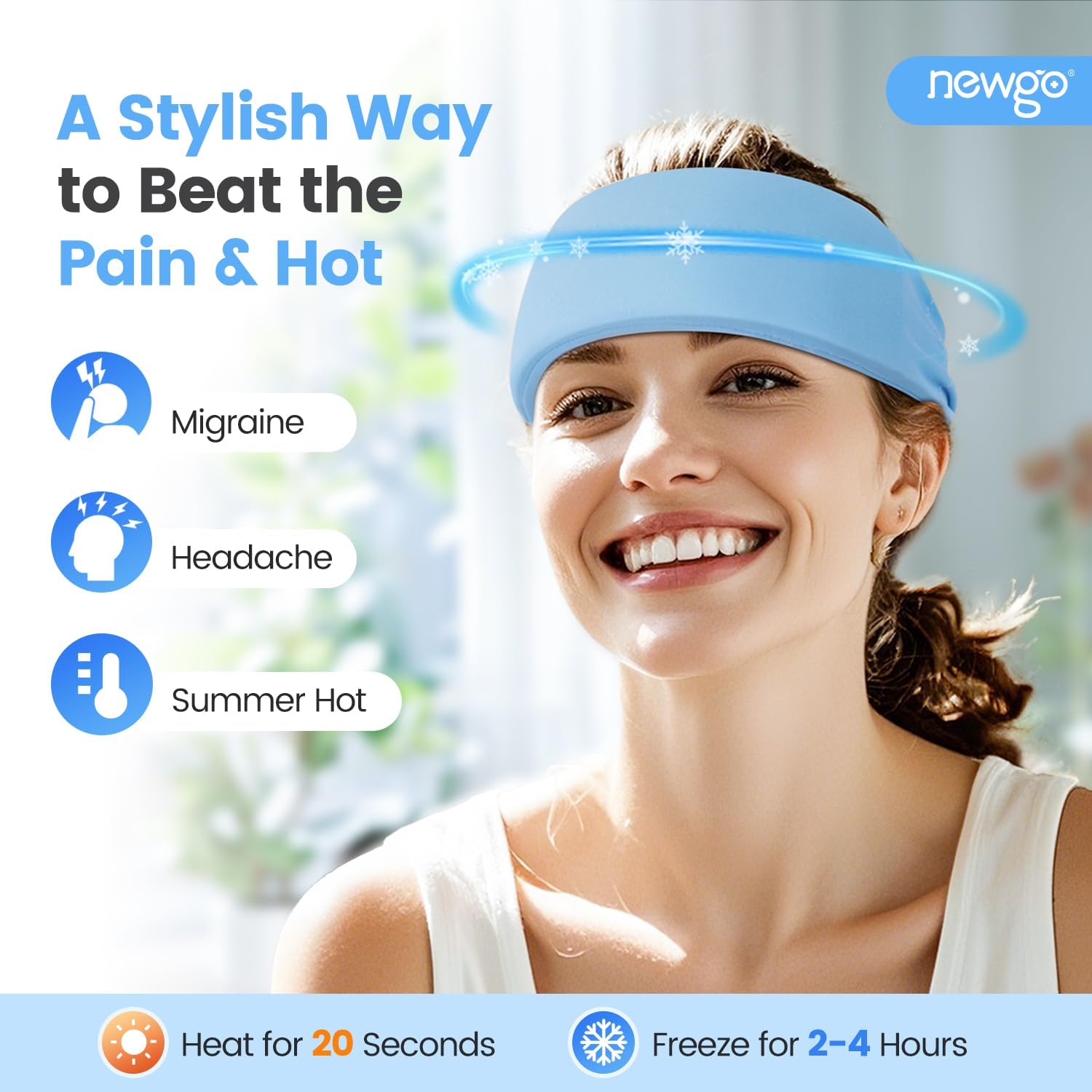 NEWGO Migraine Relief Cooling Headband with Washable Cover, Stylish Cold Head Wrap Forehead Ice Pack for Headaches, Hot Weather, Tension, Hangover