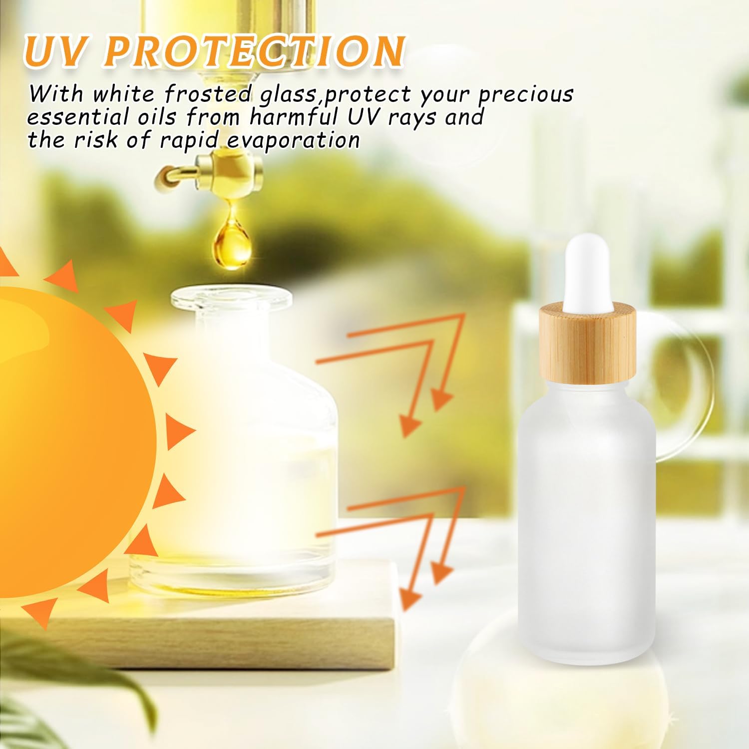- White Frosted Glass: Made of corrosion-resistant glass effectively filter out harmful ultraviolet rays,maintain active stability in frosted glass while still being able to view. each with pure glass droppers,corrosion-resistant silicone tops and natural bamboo caps;keeping your oils fresher, longer;