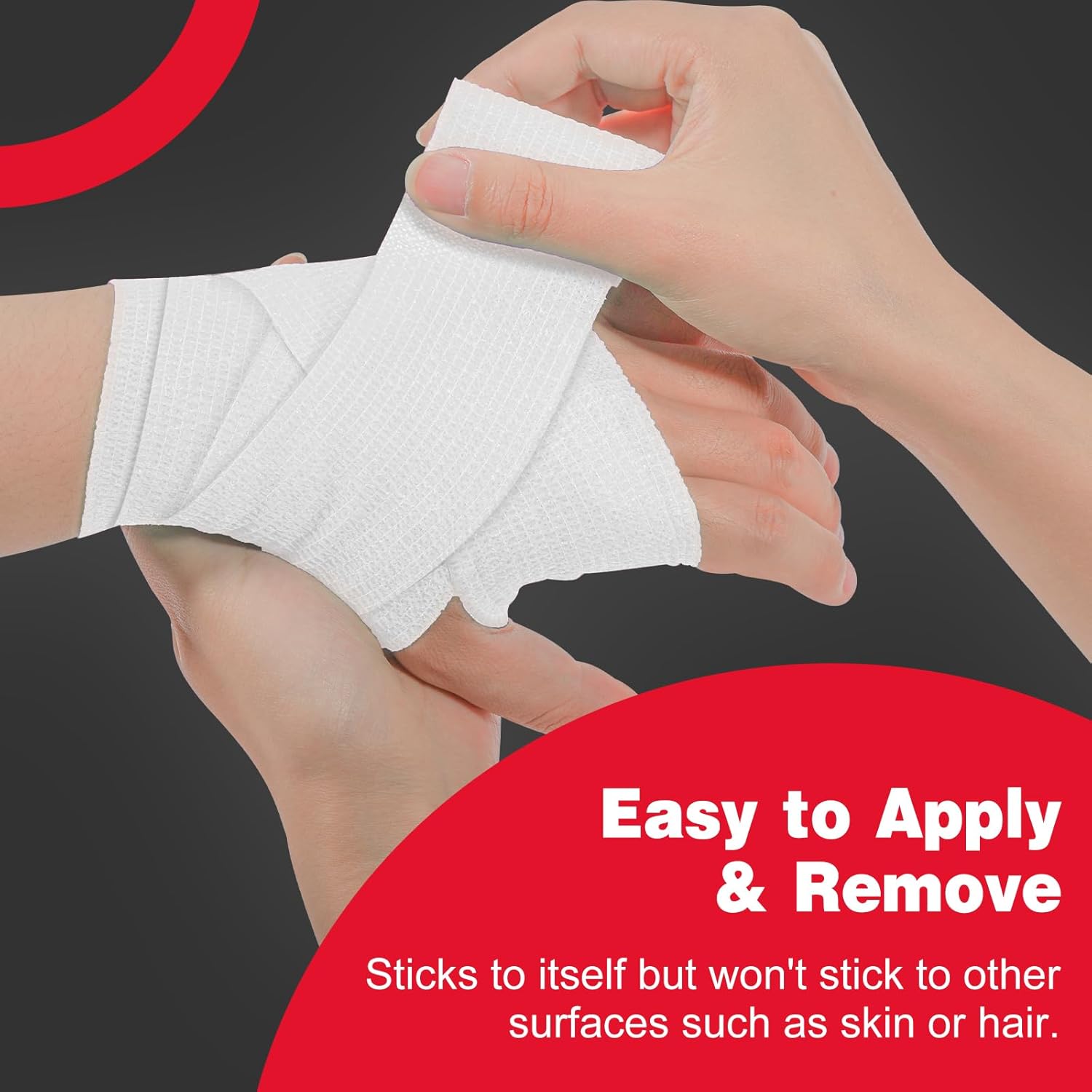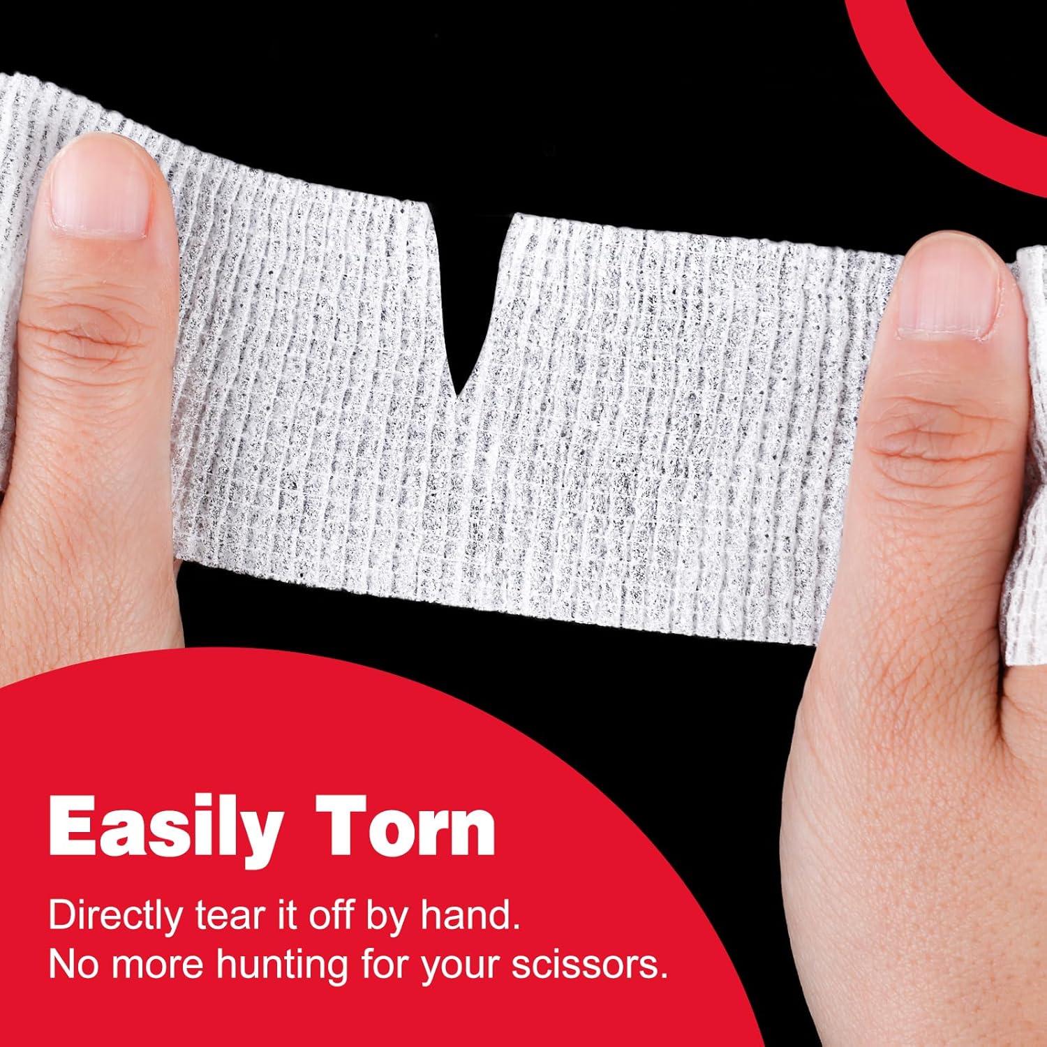 - Self Adhesive Bandage: Package includes 16 rolls of white self adhesive bandage wrap. Each roll measures 2 inch wide and 5 yards long after stretching. It easily adheres to itself but will not stick to other surfaces such as skin or hair, making it easy to pull off and change bandages