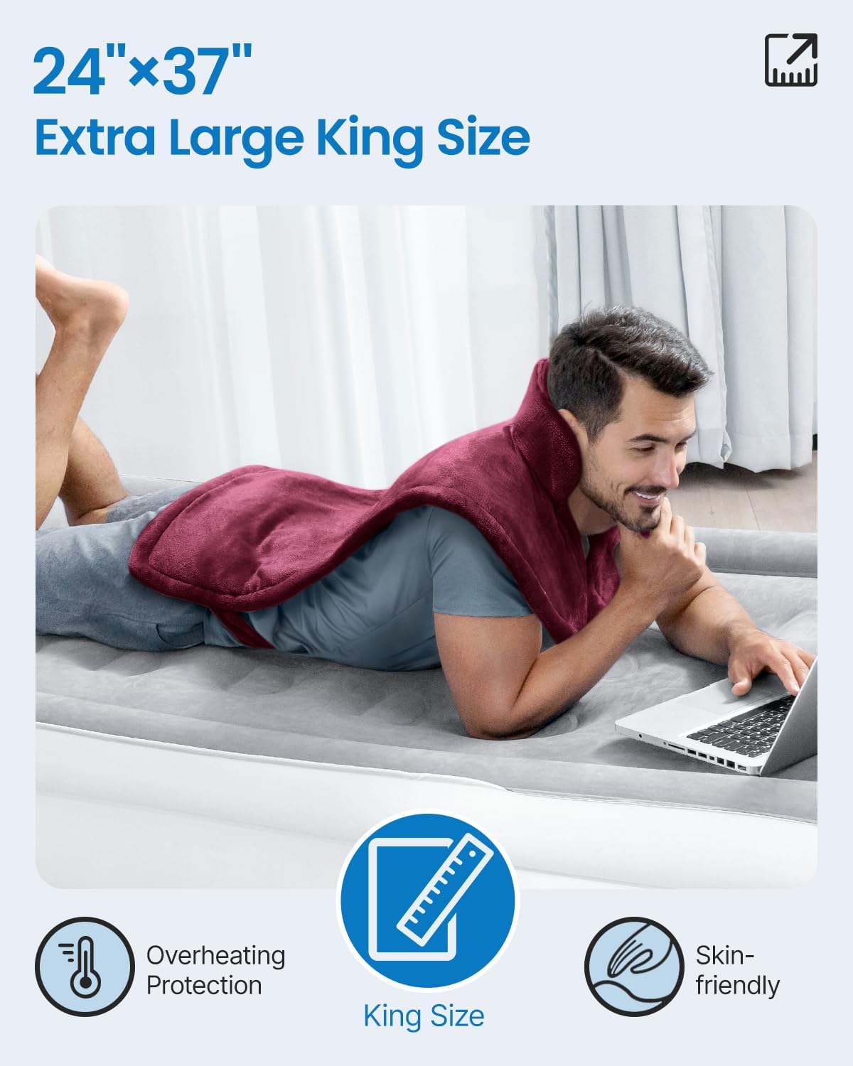 - 21"x23" Extra-large size heating pads : This large electric heating pad xxl with a curved high collar, suitable for men and women, it offers full and snug coverage to neck, shoulder, and upper back, which helps to soothe aching muscles.