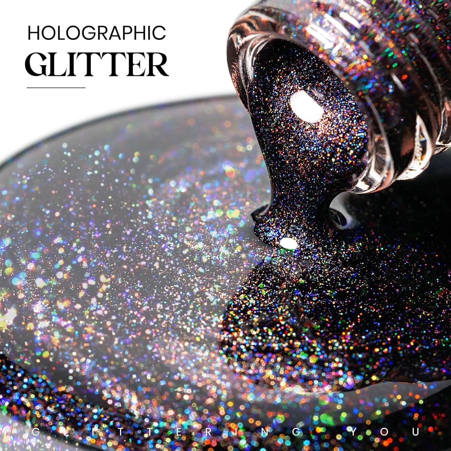 MIZHSE Holographic Nail Polish, Black Glitter Nail Polish Air Dry Fast, 15 ml 0.5 fl oz High Glossy Shiny Nail Pigment Oil-based Laser Iridescent Chrome Halo Nail Art Salon Manicure Home
