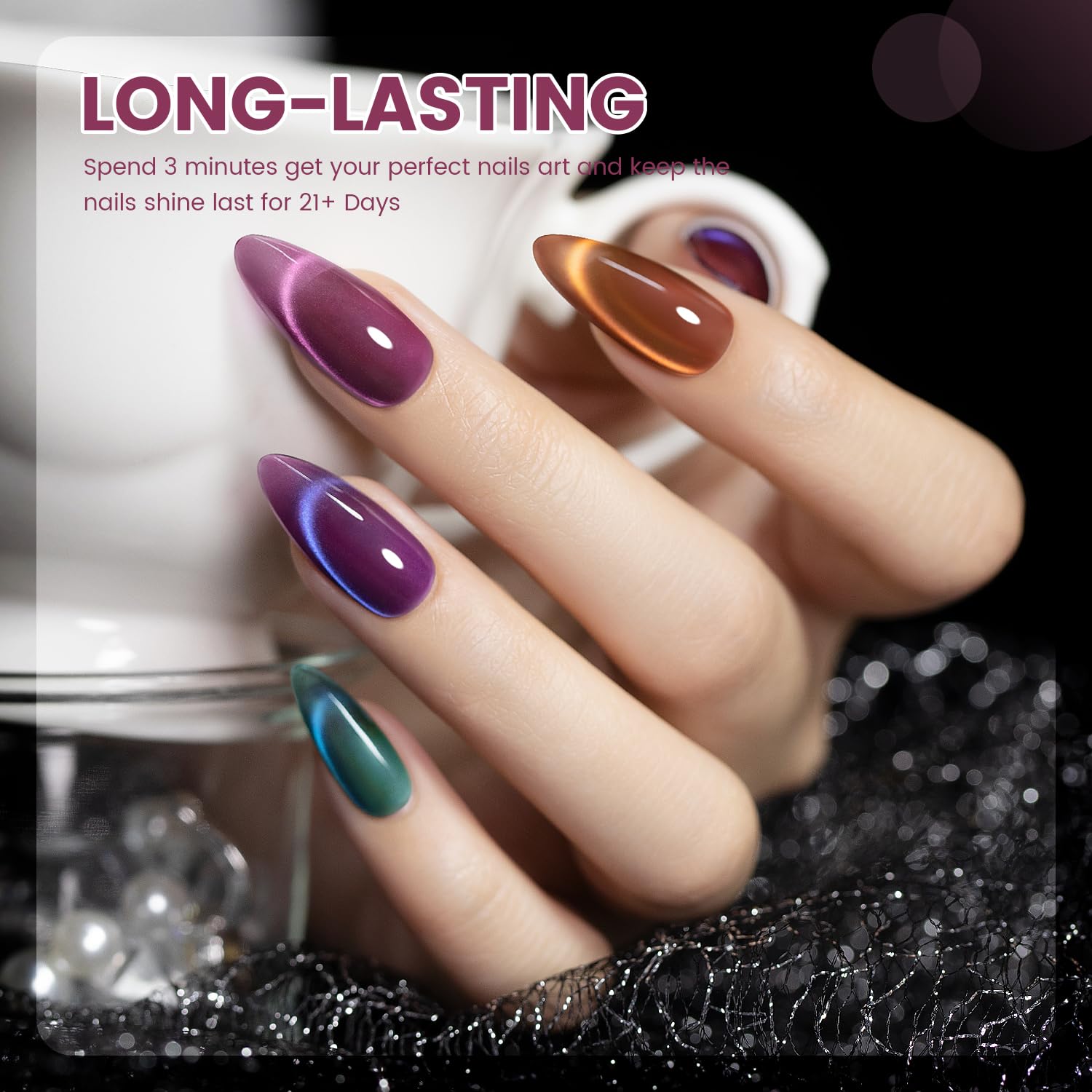 - EASY TO USE:This glass effect cat eye gel polish is made with with natural resin ingredients,magnetic shimmers,and a resin formula,so this gel polish set won't cause smudges cracks, or chips.It can last for 21 days with perfect shine under proper application