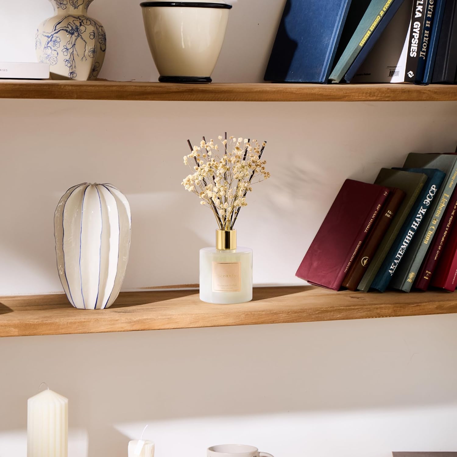COCORRÍNA Reed Diffuser - Moroccan Amber 6.7 Fl.oz Reed Diffuser Set with Sticks & Preserved Baby's Breath, Reed Diffuser for Home Bathroom Shelf Decor
