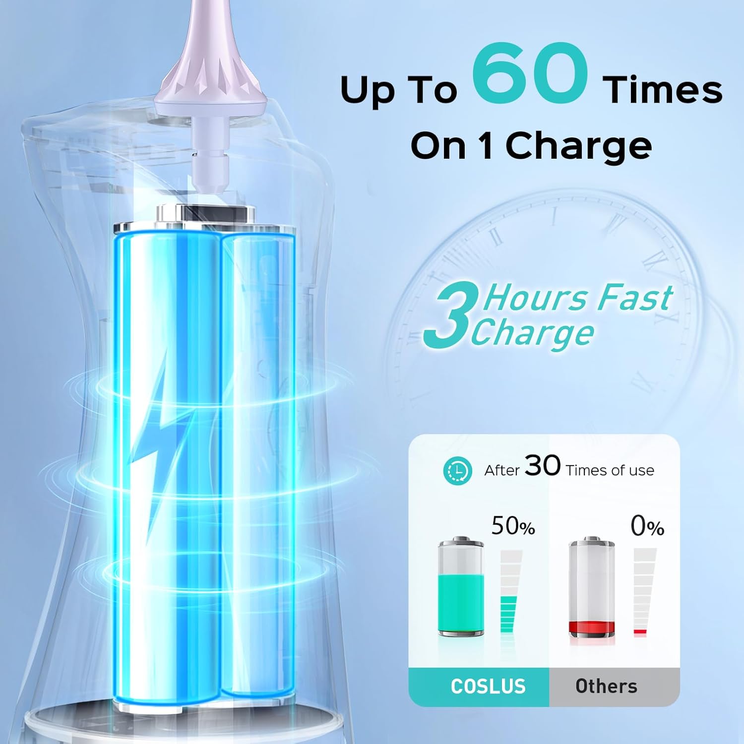 - Gentle Oral Care with Precision Clean: After 5 years of R&D by the COSLUS team, we present a certified, superior water flosser pick, the wireless flosser can offer 1400-1800 dual-pulse streams/min and 30-150PSI adjustable strong water pressure for dental plaque removal. Gum sensitive flosser with 4 multi-functional nozzles, easily removes food debris trapped between braces, meanwhile meets the comprehensive oral care of teeth, gums and tongue can effectively solve and supports oral health by targeting common concerns
