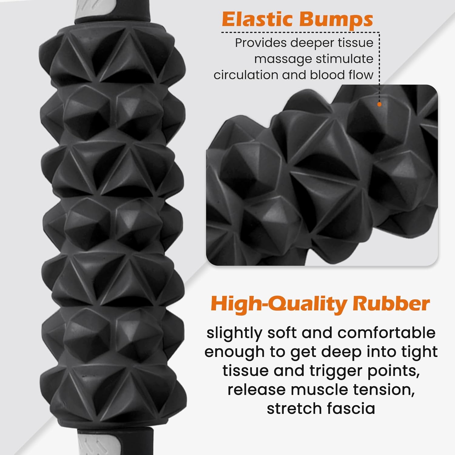 - For Relaxation: Dual grips with textured surface rubber on each grip for more stability and comfort when holding and using. The massage stick elastic bumps provide deeper tissue massage, stimulate circulation and blood flow