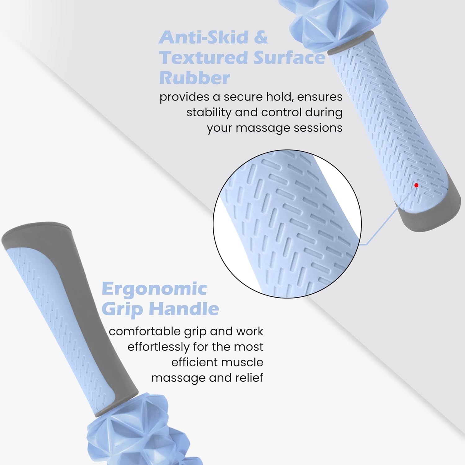 - For Relaxation: Dual grips with textured surface rubber on each grip for more stability and comfort when holding and using. The massage stick elastic bumps provide deeper tissue massage, stimulate circulation and blood flow