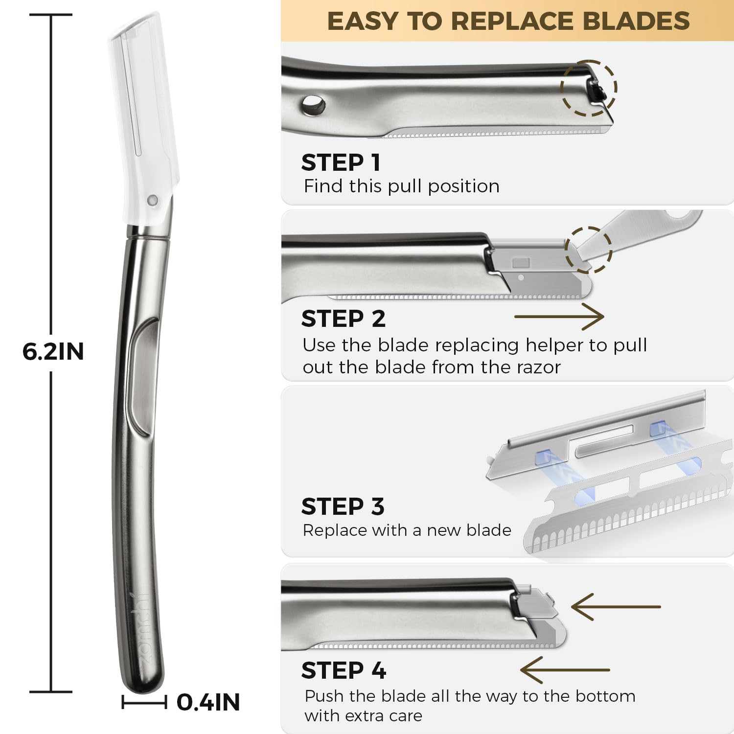- 11PCS SHARP BLADES: ZOMCHI dermaplane razor includes 11 stainless steel blades—6 wide blades specifically for facial exfoliation and peach fuzz removal, and 5 micro blades for detailed eyebrow shaping. Enjoy professional dermaplaning safely at home. It's recommended to change the blade every 3 to 4 weeks.