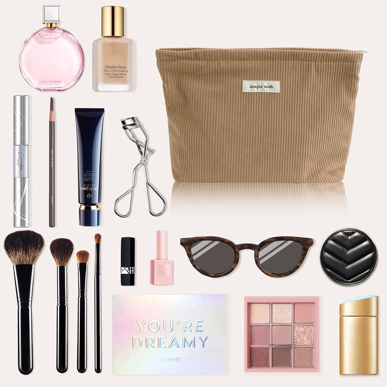 Wudygirl Corduroy Makeup Bag Cosmetic Bag for Women Cute Makeup Organizer Travel Cosmetic Pouch Toiletry Bag Aesthetic Handbag Pouches for Purse with Zipper (Camel)