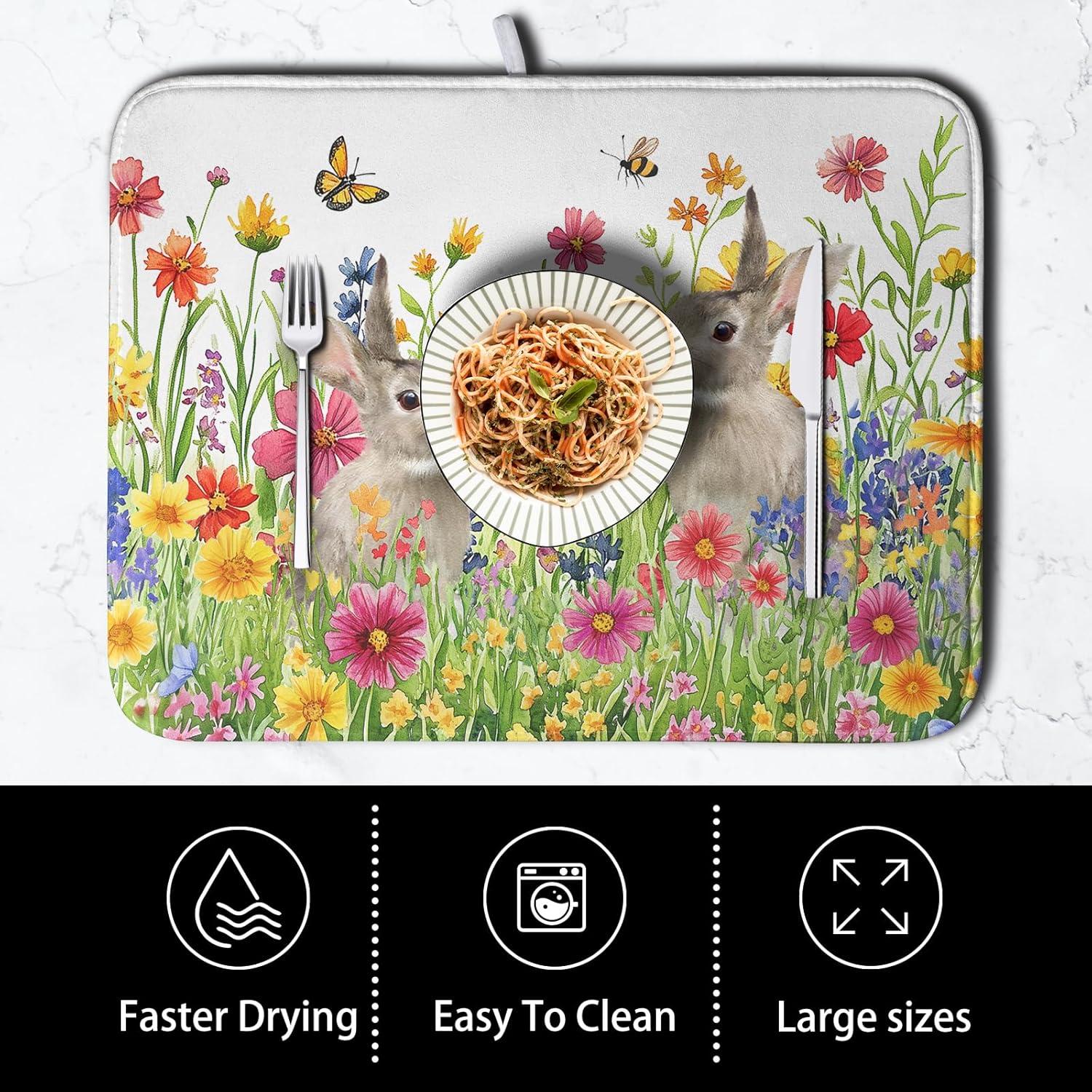 - Multifunctional Pad: Beautiful print on surface side, and reverses to a solid color. The easter kitchen drying mat absorbs water well, great for air drying dishes, glasses, bottles, silverware, fruits and vegetables, adds stability when drying fragile items