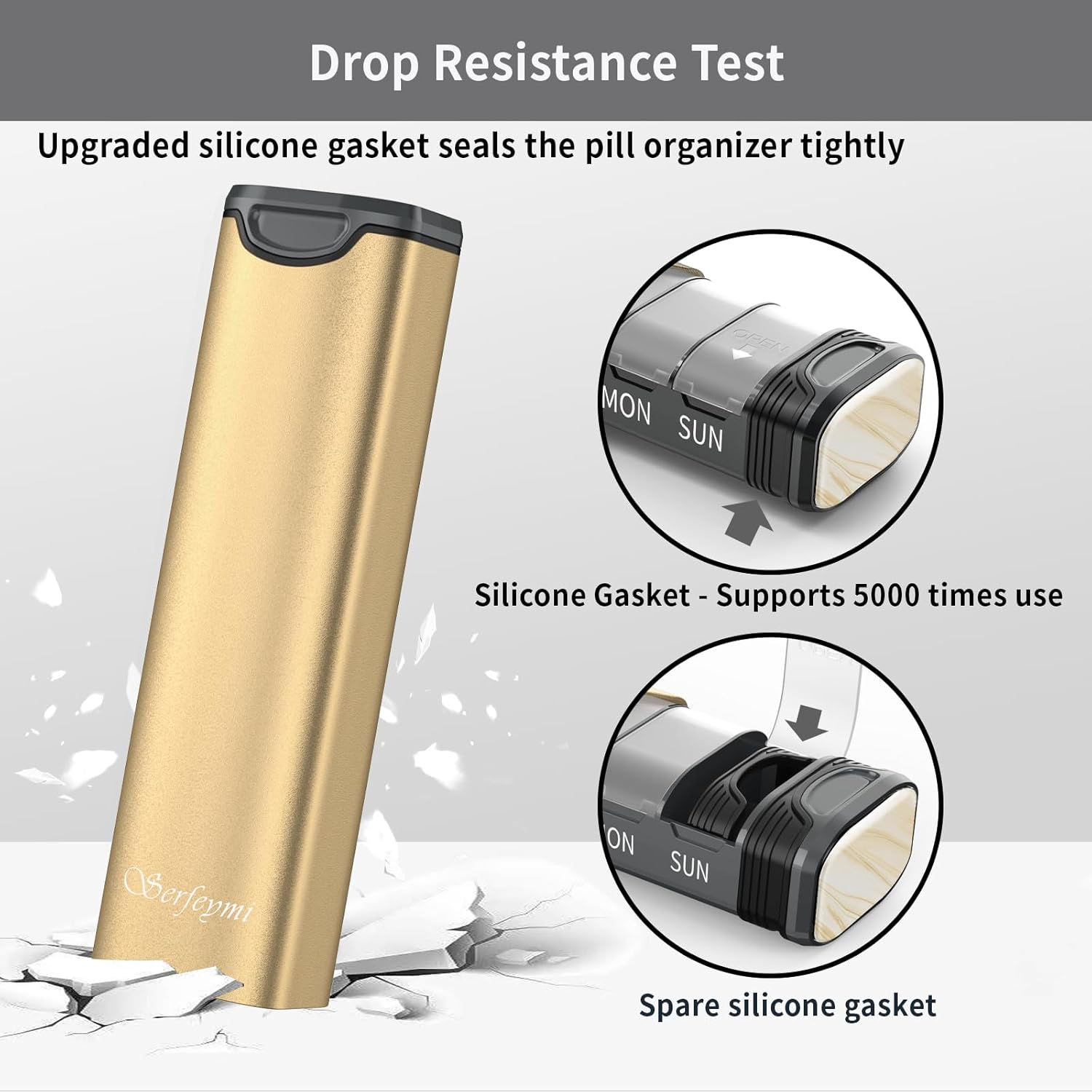 Metal Weekly Pill Organizer, Serfeymi Aluminum Daily Pill Box(Spare Gasket Provided),7 Day Pill Case Travel Medicine Organizer,Pill Containers with Individual Lid for Vitamins,Pills, Supplement-Gold