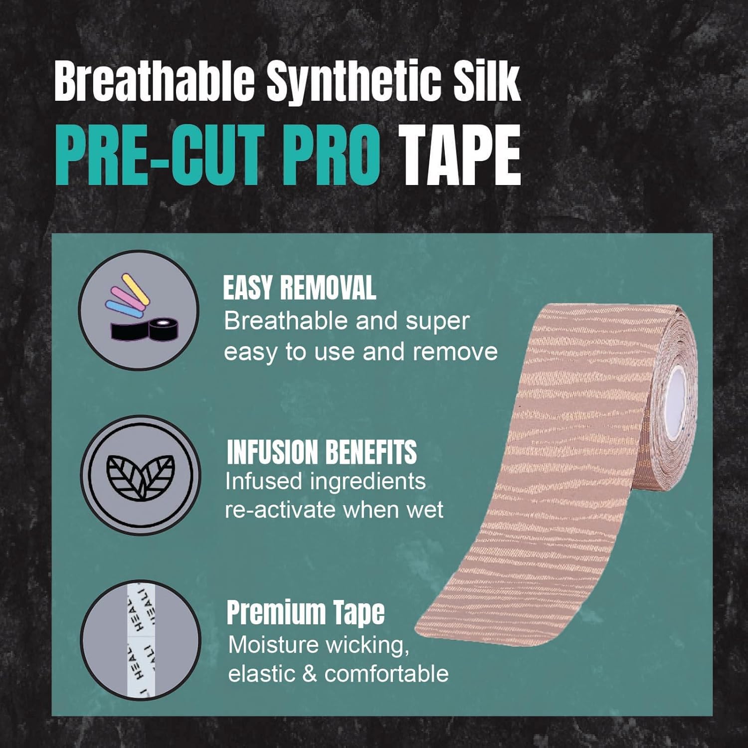 - Product Count: 20 precut strips per roll of pro kinesiology tape. Strip Size (Width x Length) - 5cm x 25cm 2" x 10"; Product Type: Precut. Heali PRO Kinesiology Tape is infused with Magnesium and Menthol directly on the tape for faster recovery and support. Heali PRO Tape is made with soft and breathable synthetic silk and is latex free. The strong (sticky) adhesive lasts for 4-7 days.