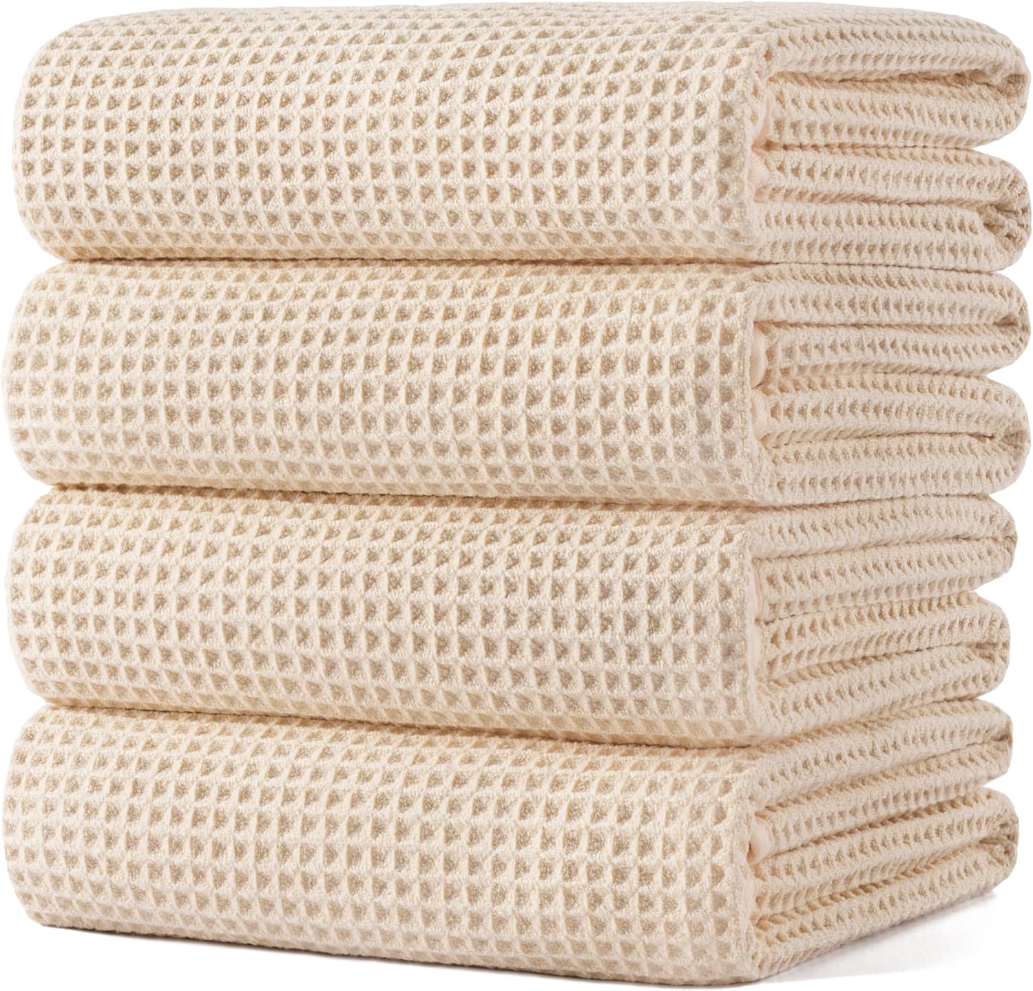 POLYTE Microfiber Oversize Quick Dry Lint Free Bath Towel, 60 x 30 in, 4 Pack (Waffle Weave)