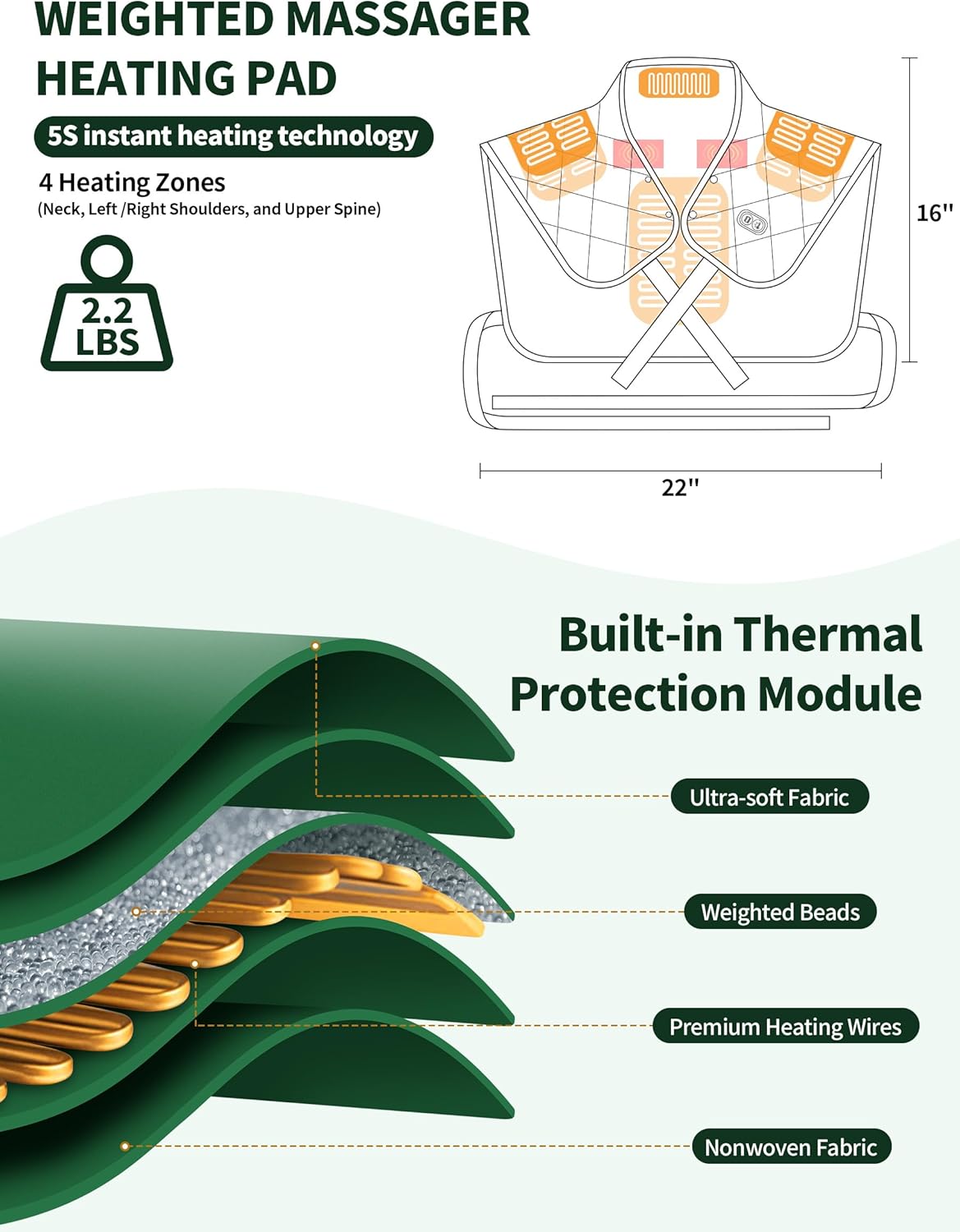 Vofuoti Heating Pad for Neck and Shoulders, Portable Heating Pad with Massager and Battery, Weighted Electric Heated Neck Shoulder Wrap, 16'' x 22'', 2.2lbs