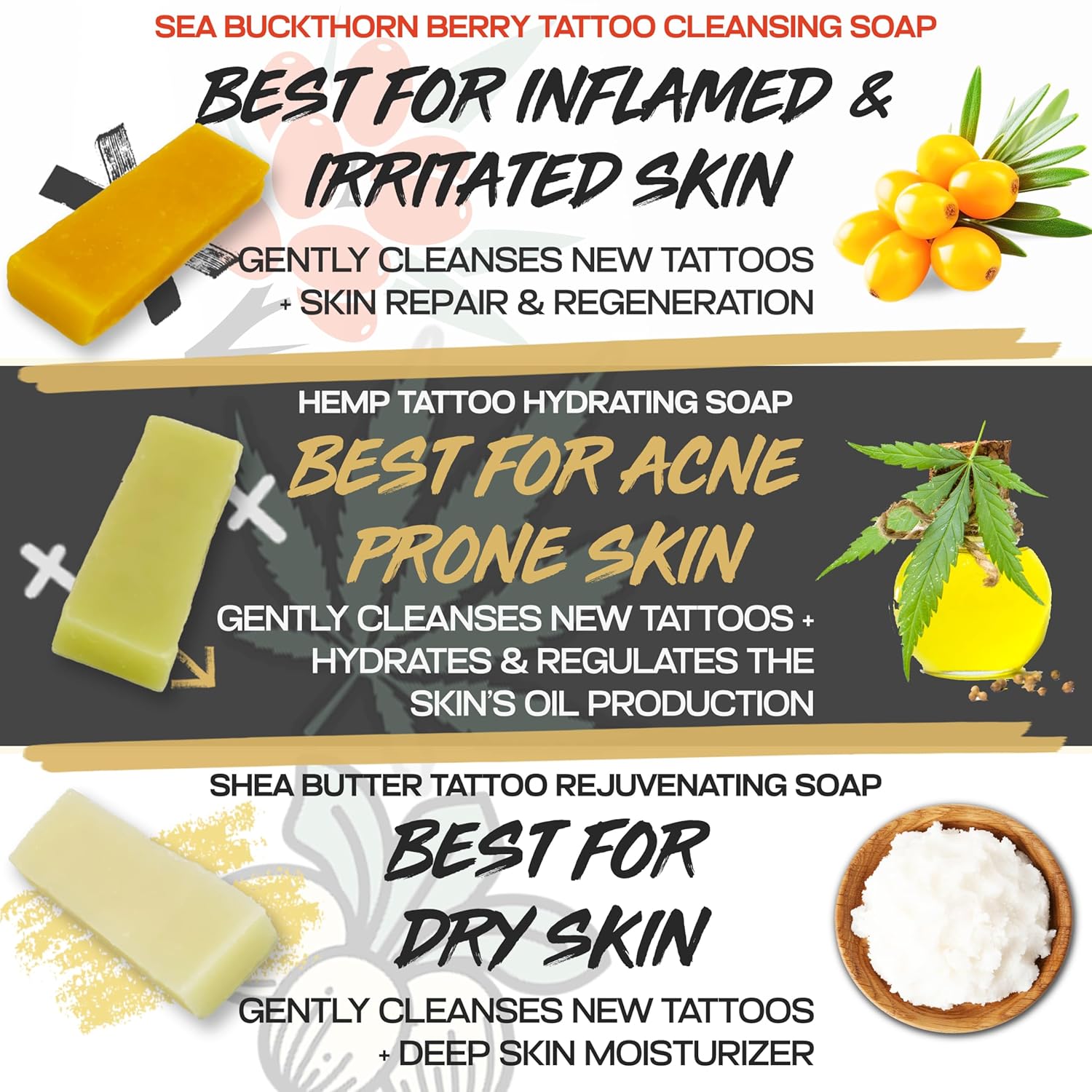 - Formulated with moisturizing shea butter, sea buckthorn berry, hemp seed oil, and jojoba oil, these hydrating tattoo cleansing bars help prevent scabbing, reduce irritation, and soothe freshly tattooed skin. The natural cleansing properties assist in keeping tattoos clean while protecting the skin and tattoo