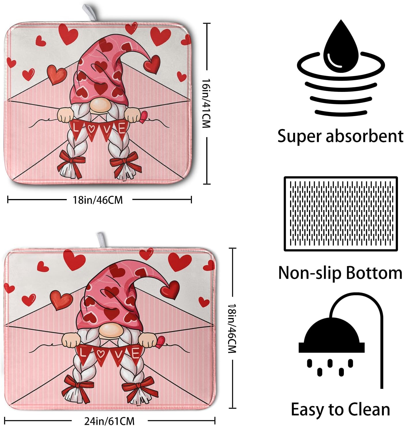 Valentine's Day Love Letter Dish Drying Mat for Kitchen Counter, Love Letter Gnome Absorbent Dish Pad Large Dish Drainer Mats for Countertop 16x18 Inch