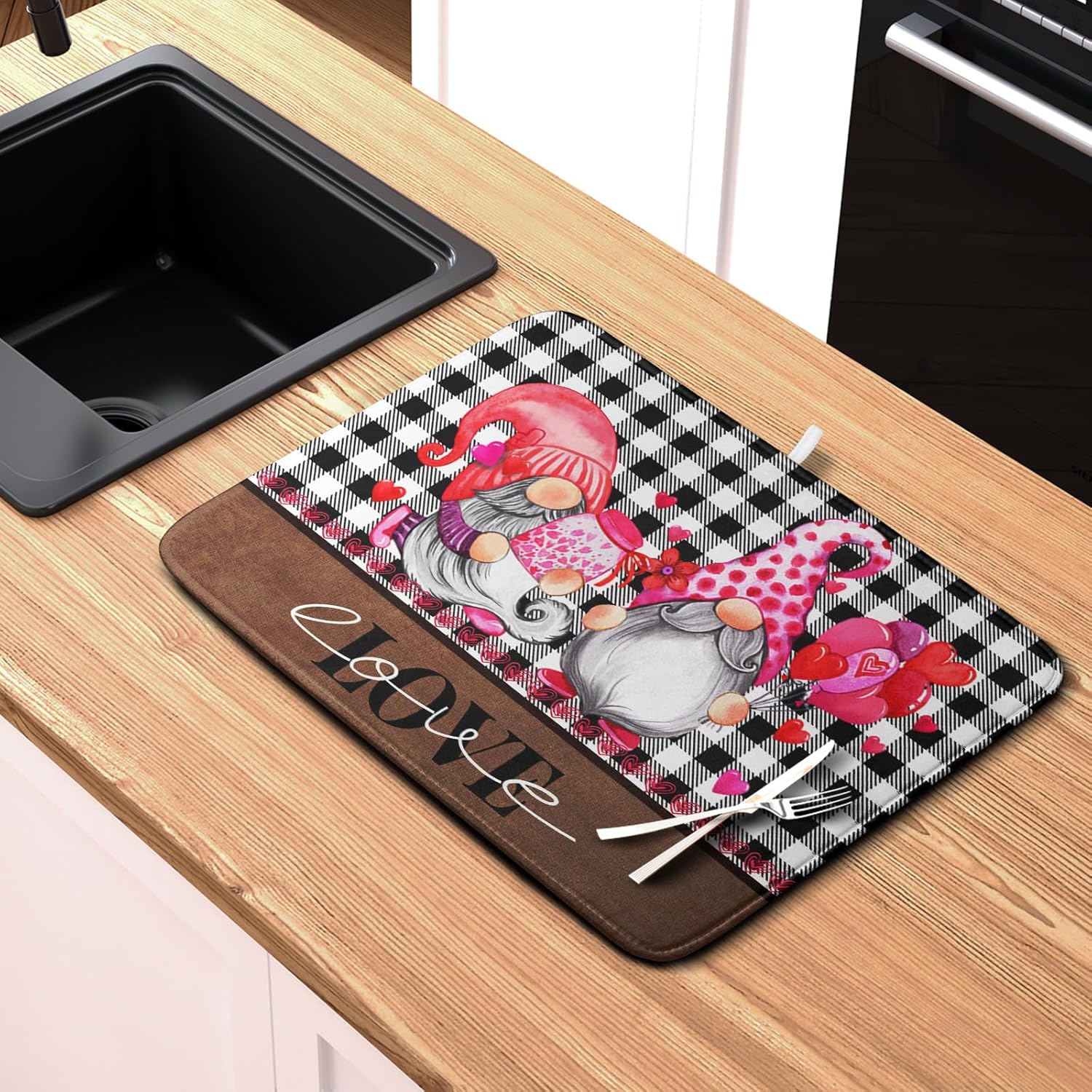 Valentine's Day Dish Drying Mats for Kitchen Counter, Gnome Love Kitchen Drying Mat, Buffalo Plaid Dish Drainer Mat Absorbent Quick Dry Dishes Pad 16 x 18 In - Farmhouse Decor Valentines Gift