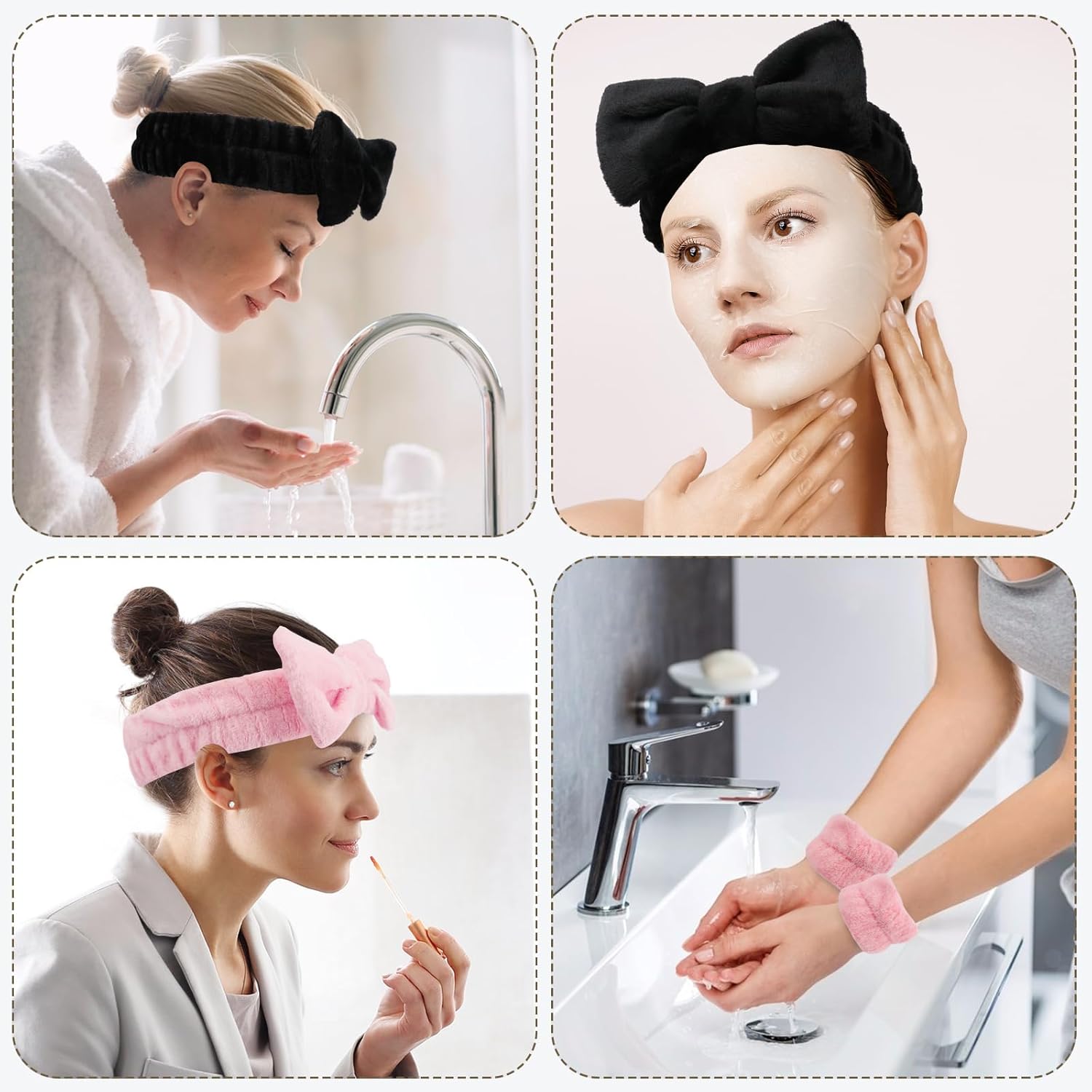 - Microfiber Spa Headband and Wristband for Face Washing: the package contains face wash headband and 2pcs wristband, the headband can hold hair back securely out of the way, and the wristband can effectively prevent water from flowing down your arms and avoid wet sleeves when you wash your face.