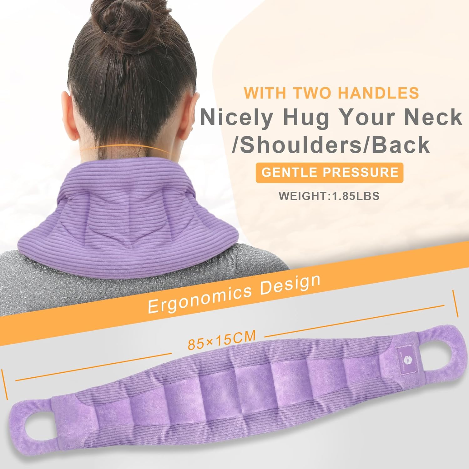 - Ergonomics Design: The heat pack is perfect for the neck and shoulders. With two handles, it is flexible for any body part. Also, the weight of the filling will put gentle pressure on the target area, and help you relieve the discomfort