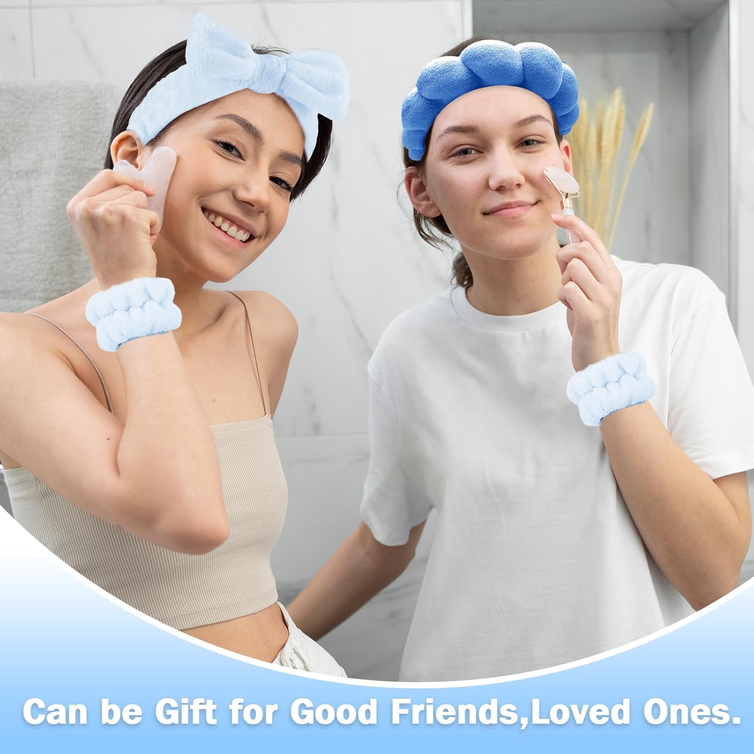 - SPA HEADBAND AND WRISTBAND MATERIAL: Patent No.: US D1018980 S.Spa headband and wristband set is the perfect gift solution.Bubble Spa headband for women the sponge lining used and the terry cloth covering the surface. These skincare headbands have a strong water absorption function and can be used when you are washing your face, skincare or makeup. And wristbands also have good elasticity, can be stretched to fit your wrist better.Preppy skincare headband, grwm headband