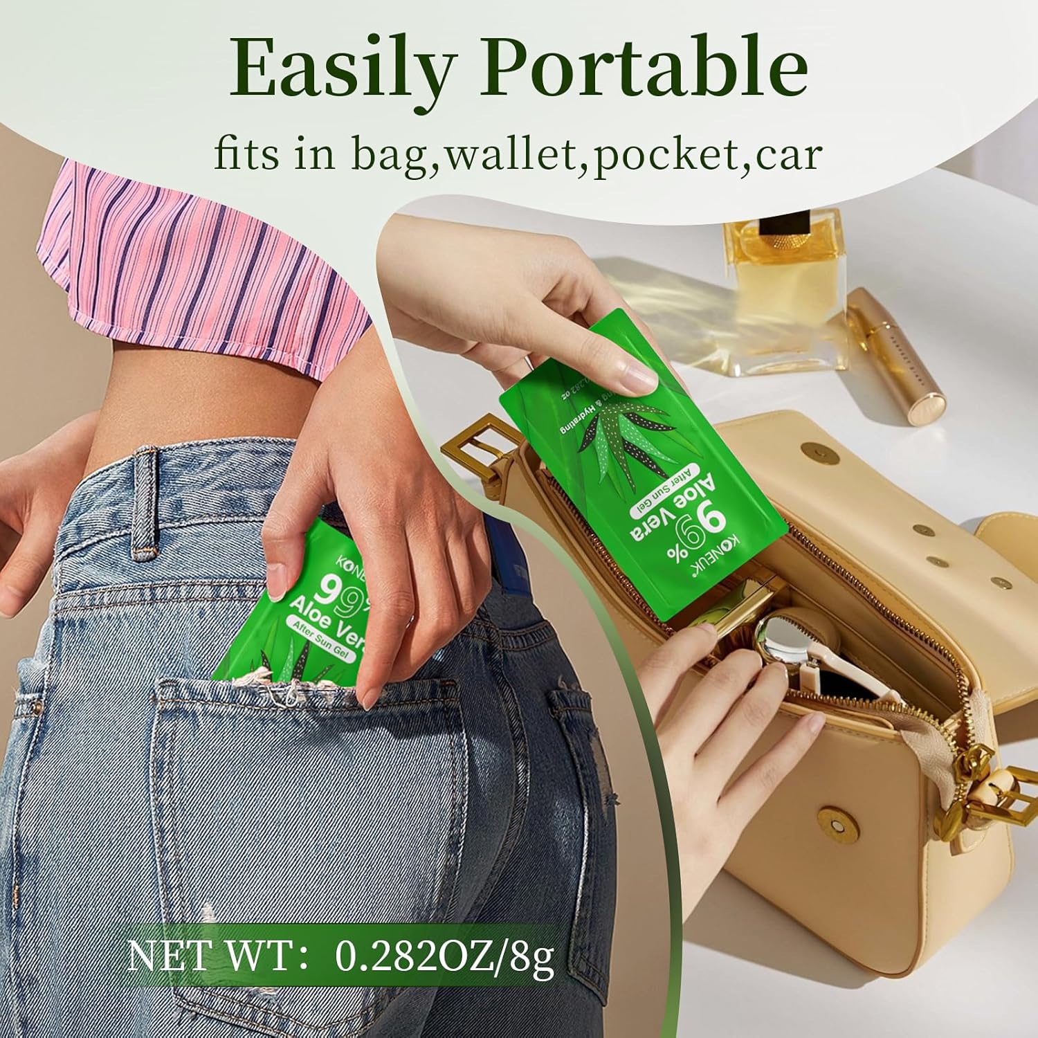 - 【99% Pure Aloe Vera Gel】This set of aloe vera gel has 100 packs,each pack is 0.282oz,each pack of aloe vera gel is individually packaged,which is very suitable for carrying around,when you use these aloe vera gel,you will feel very relaxed and cool,it quickly absorbed,and free of any sticky residue,leaving your skin moisturized and smooth