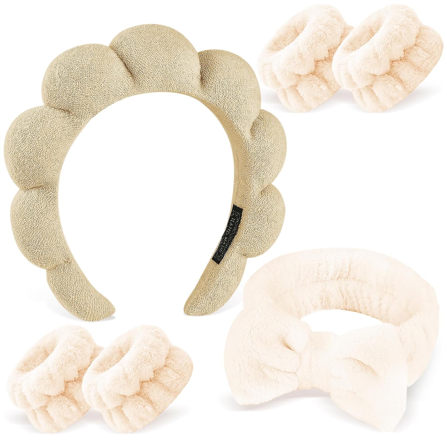 - SPA HEADBAND AND WRISTBAND MATERIAL: Patent No.: US D1018980 S.Spa headband and wristband set is the perfect gift solution.Bubble Spa headband for women the sponge lining used and the terry cloth covering the surface. These skincare headbands have a strong water absorption function and can be used when you are washing your face, skincare or makeup. And wristbands also have good elasticity, can be stretched to fit your wrist better.Preppy skincare headband, grwm headband